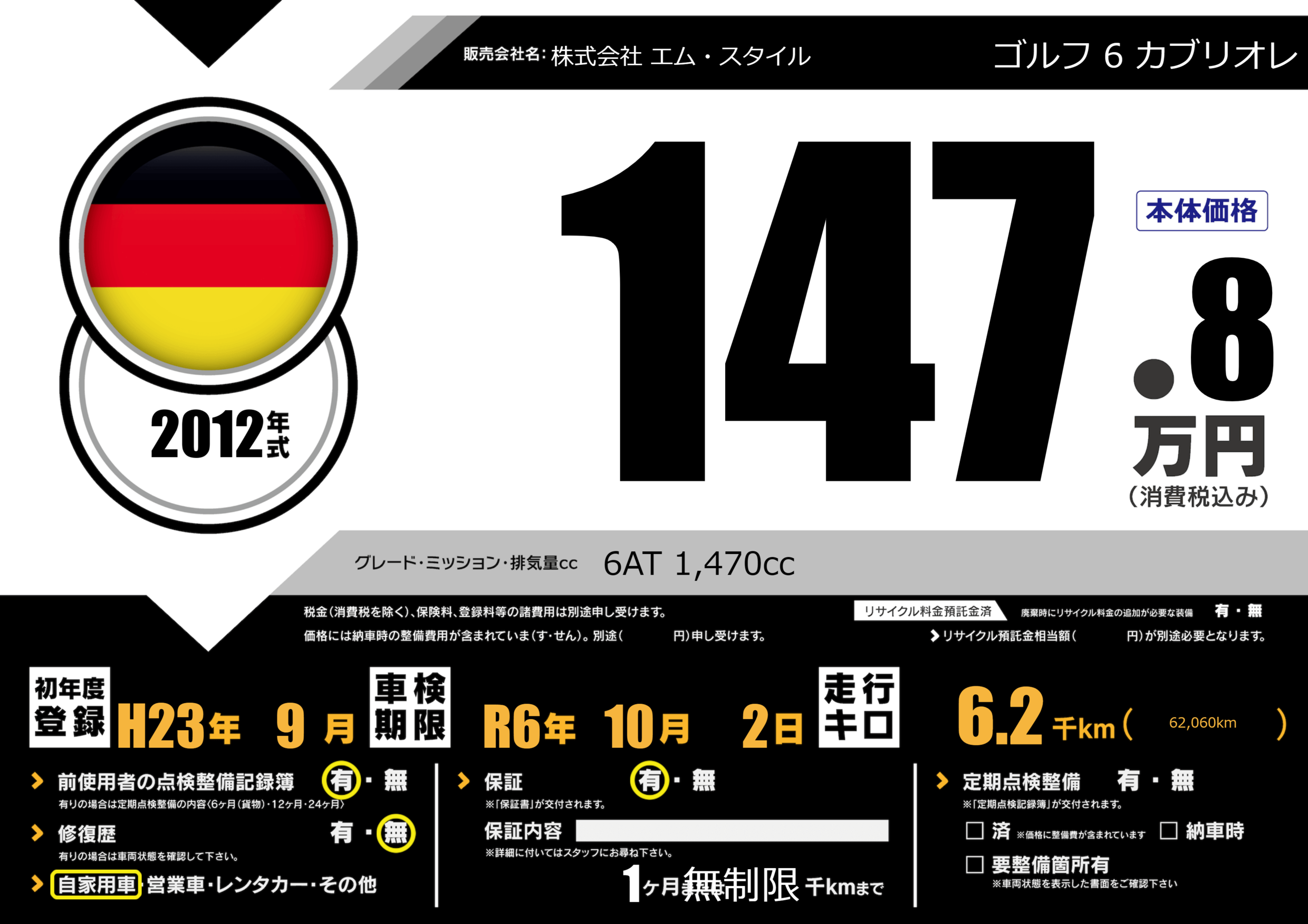 | 車名 | ゴルフ 6 カブリオレ | グレード ミッション 排気量 |