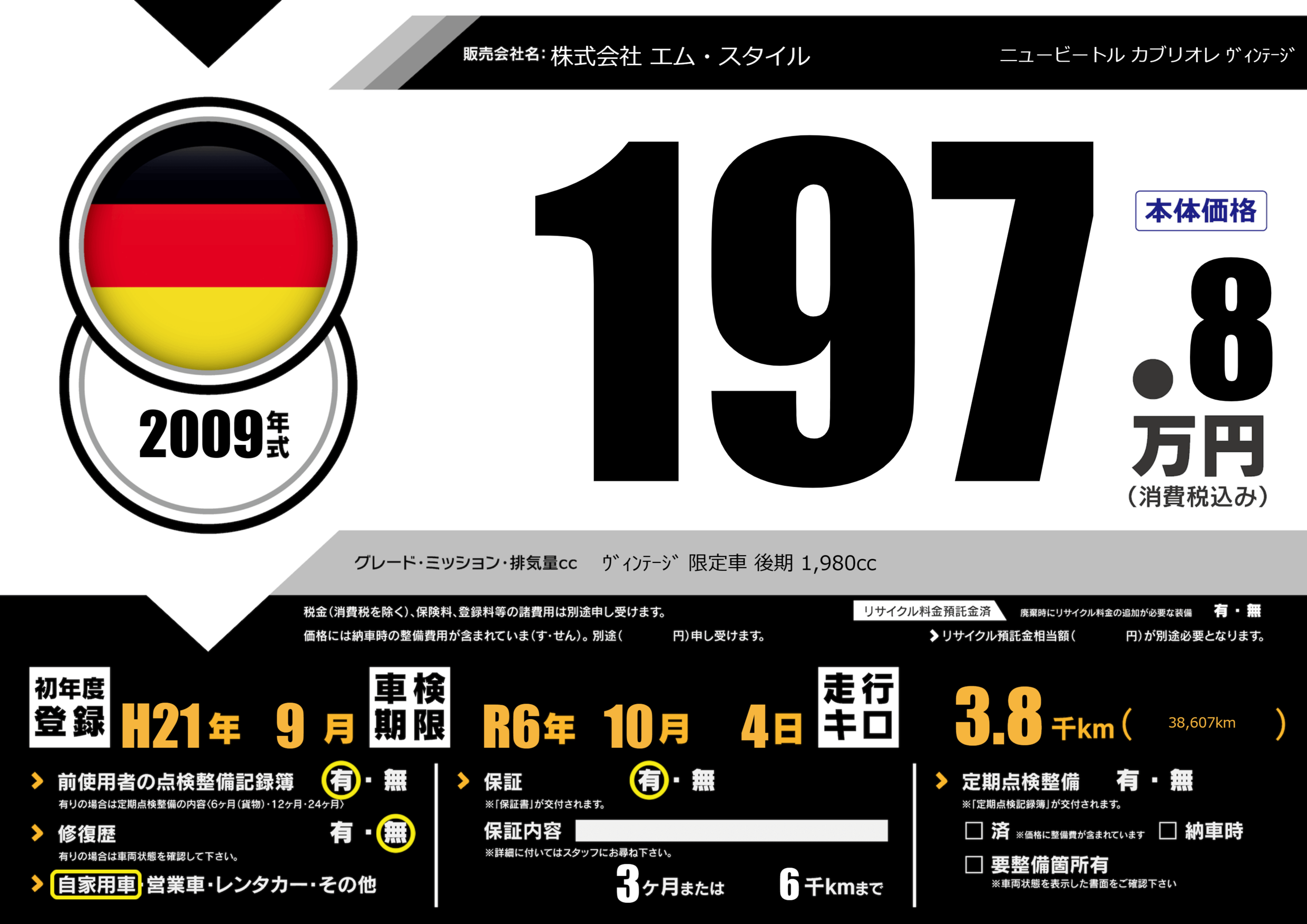 保証付き 保証内容(---) 3ヶ月または(6)千kmまで |