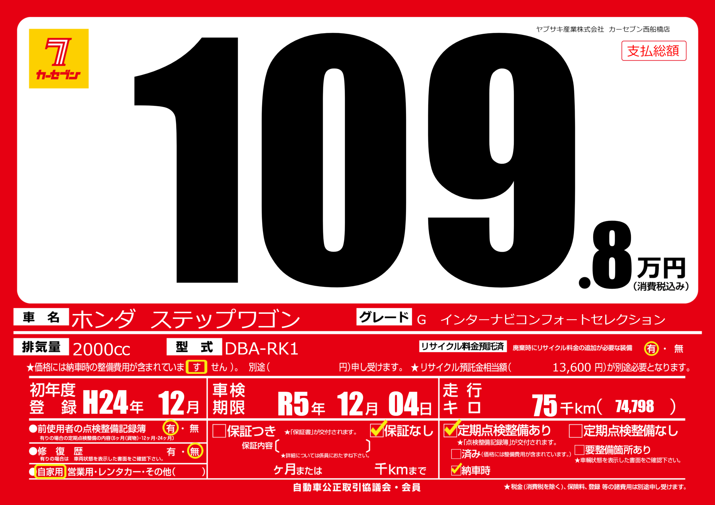| 走行キロ | 7.5万km | 初年度登録 | H24年12月 |