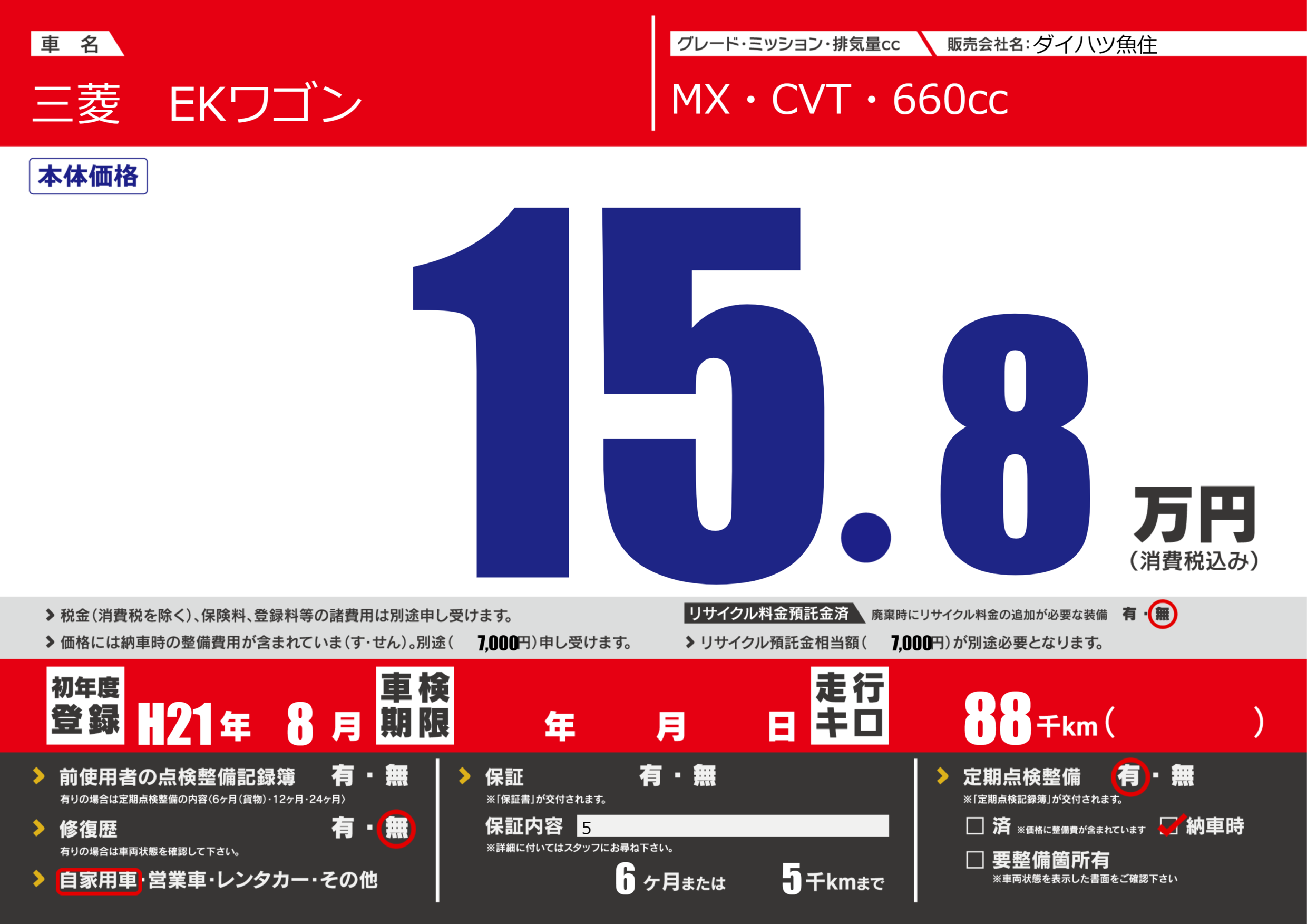 保証なし 保証内容(5) 6ヶ月または(5)千kmまで |