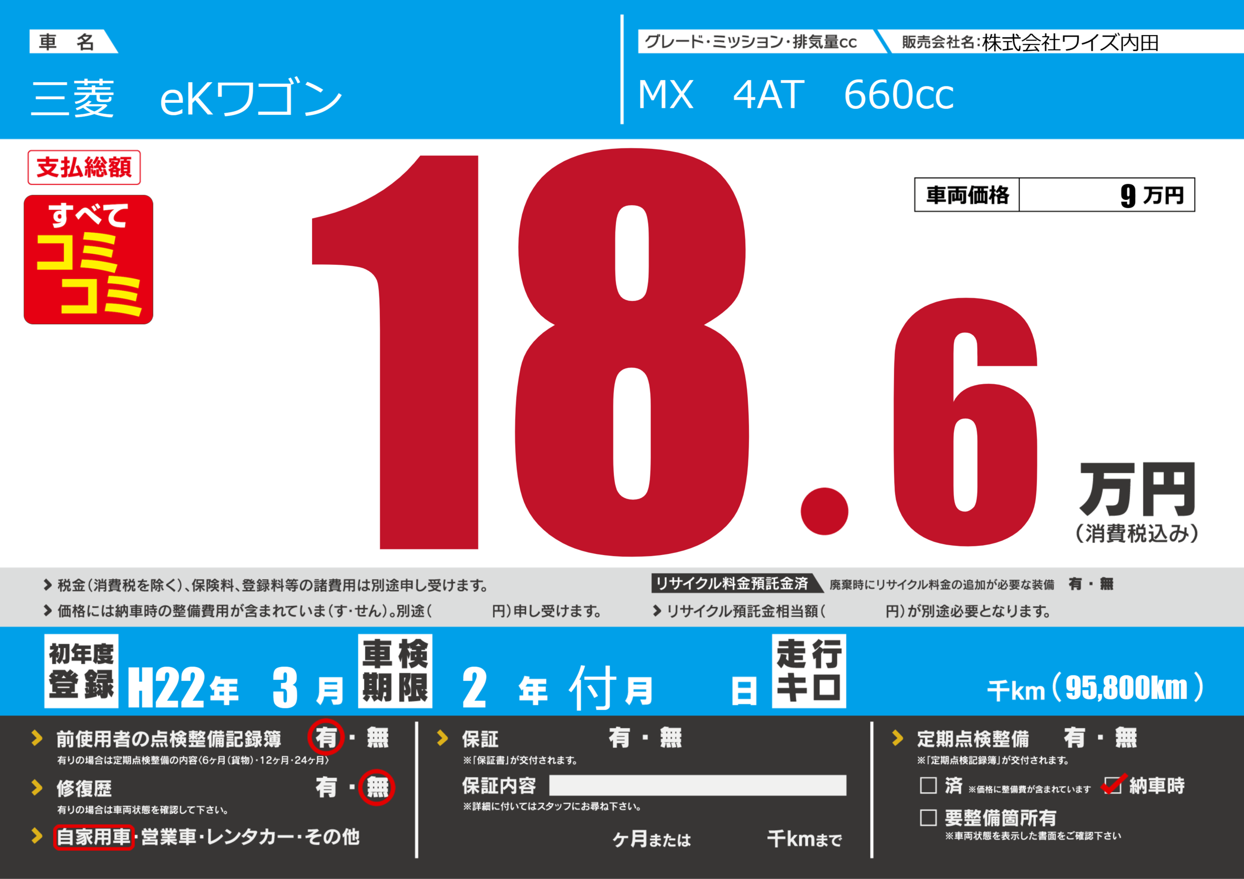 | 車名 | 三菱 eKワゴン | グレード ミッション 排気量 |