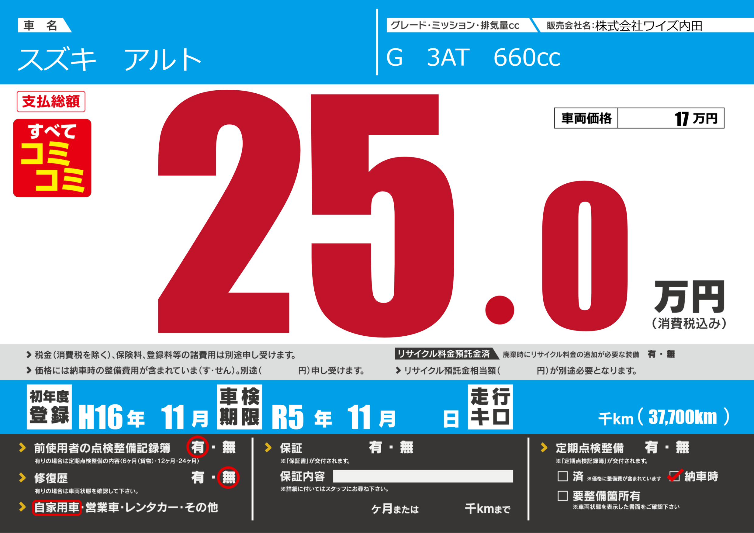 | 車名 | スズキ アルト | グレード ミッション 排気量 |
