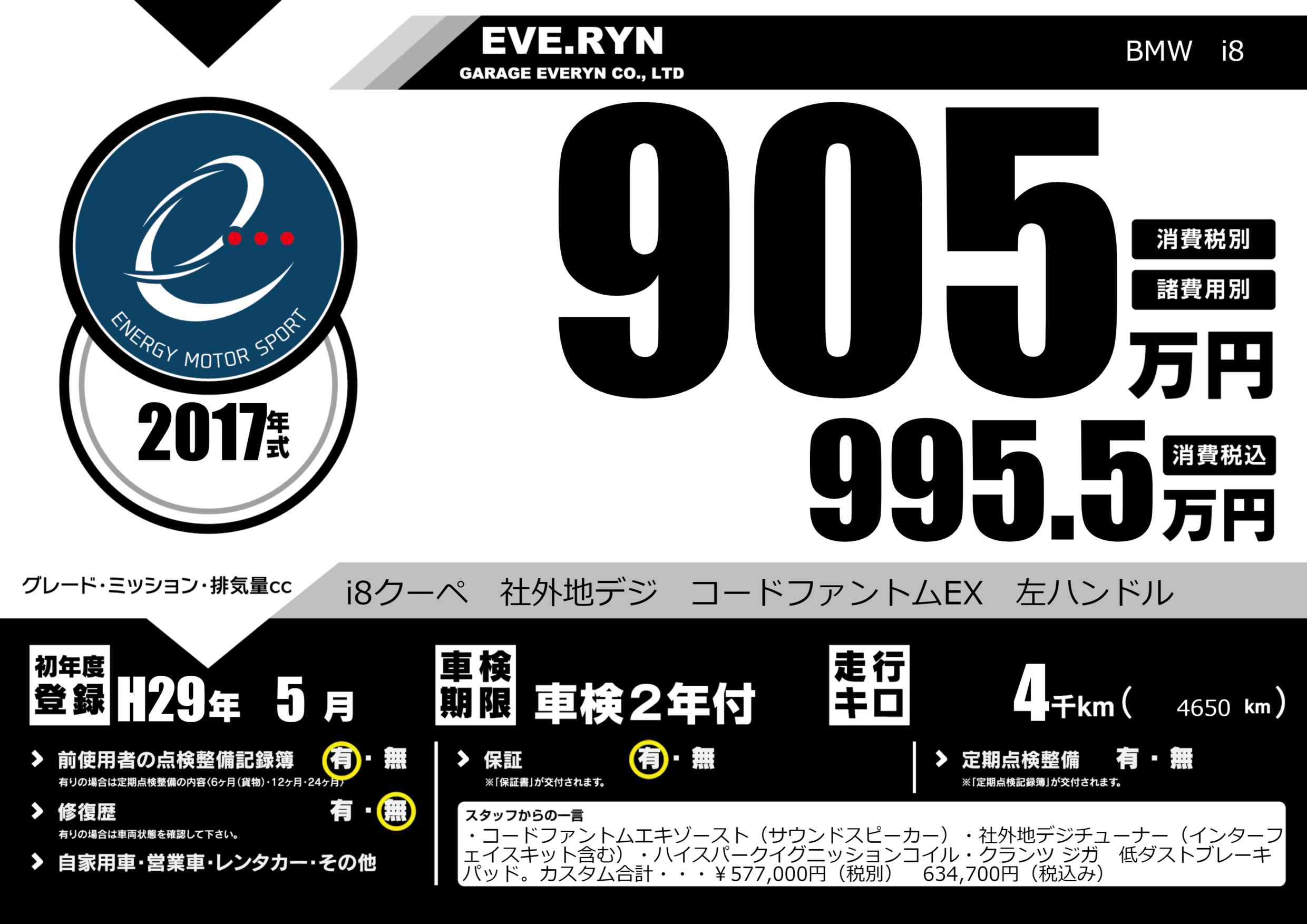| 車名 | BMW i8 | グレード ミッション 排気量 |