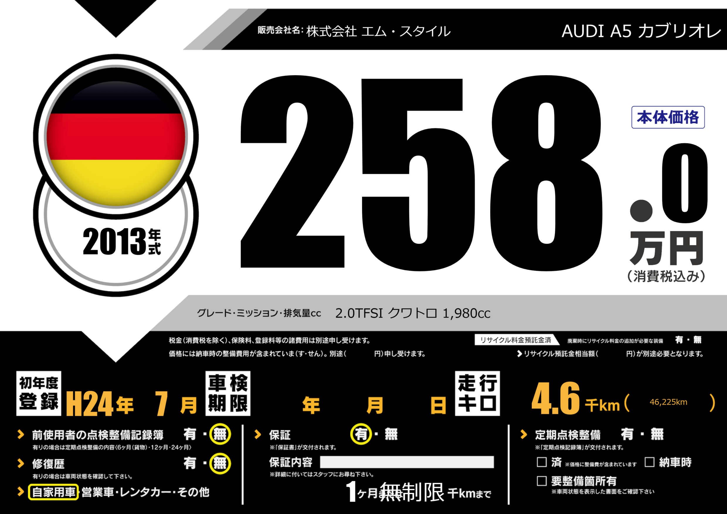 | 車名 | AUDI A5 カブリオレ | グレード ミッション 排気量 |