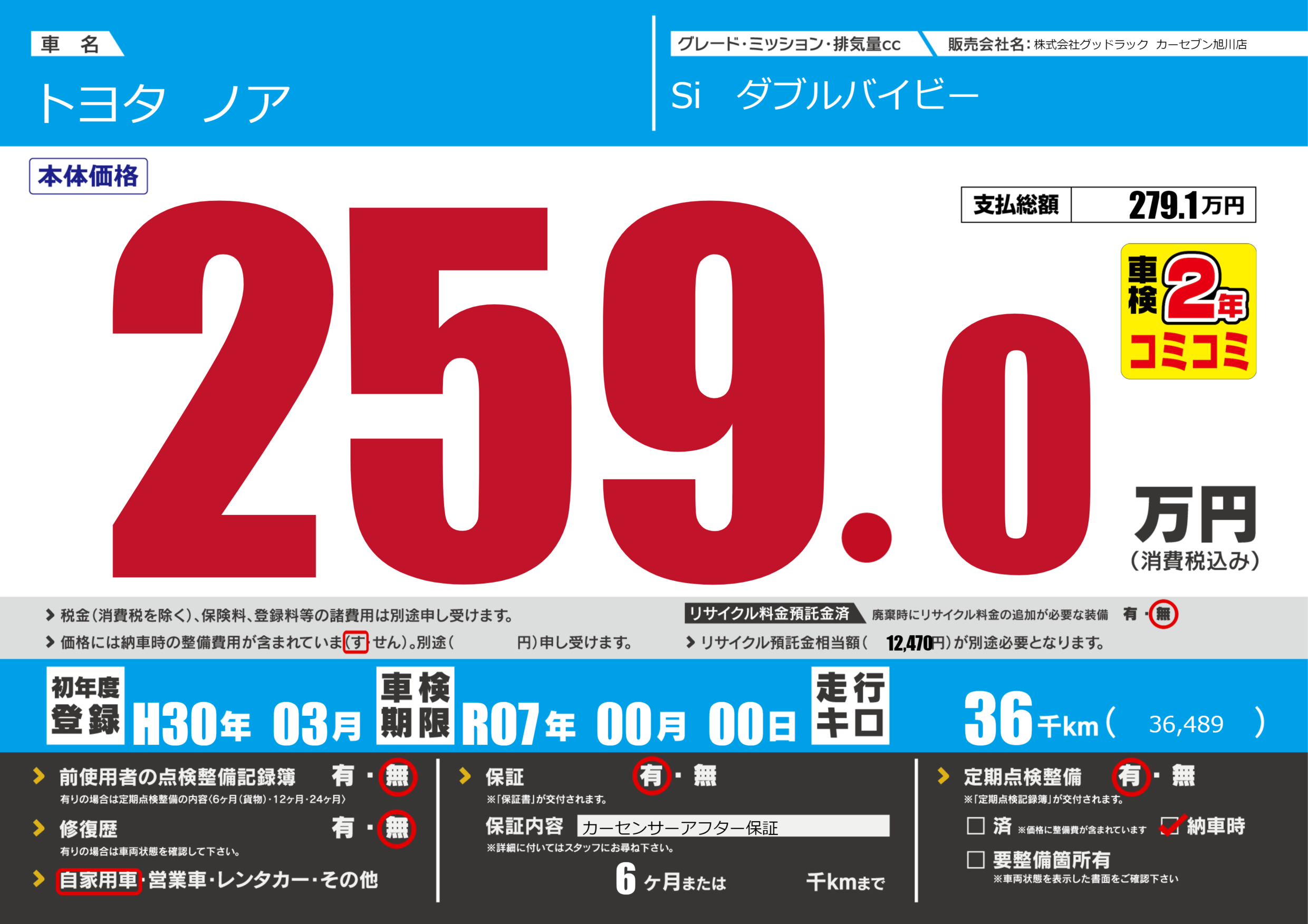 | 車名 | トヨタ ノア | グレード ミッション 排気量 |