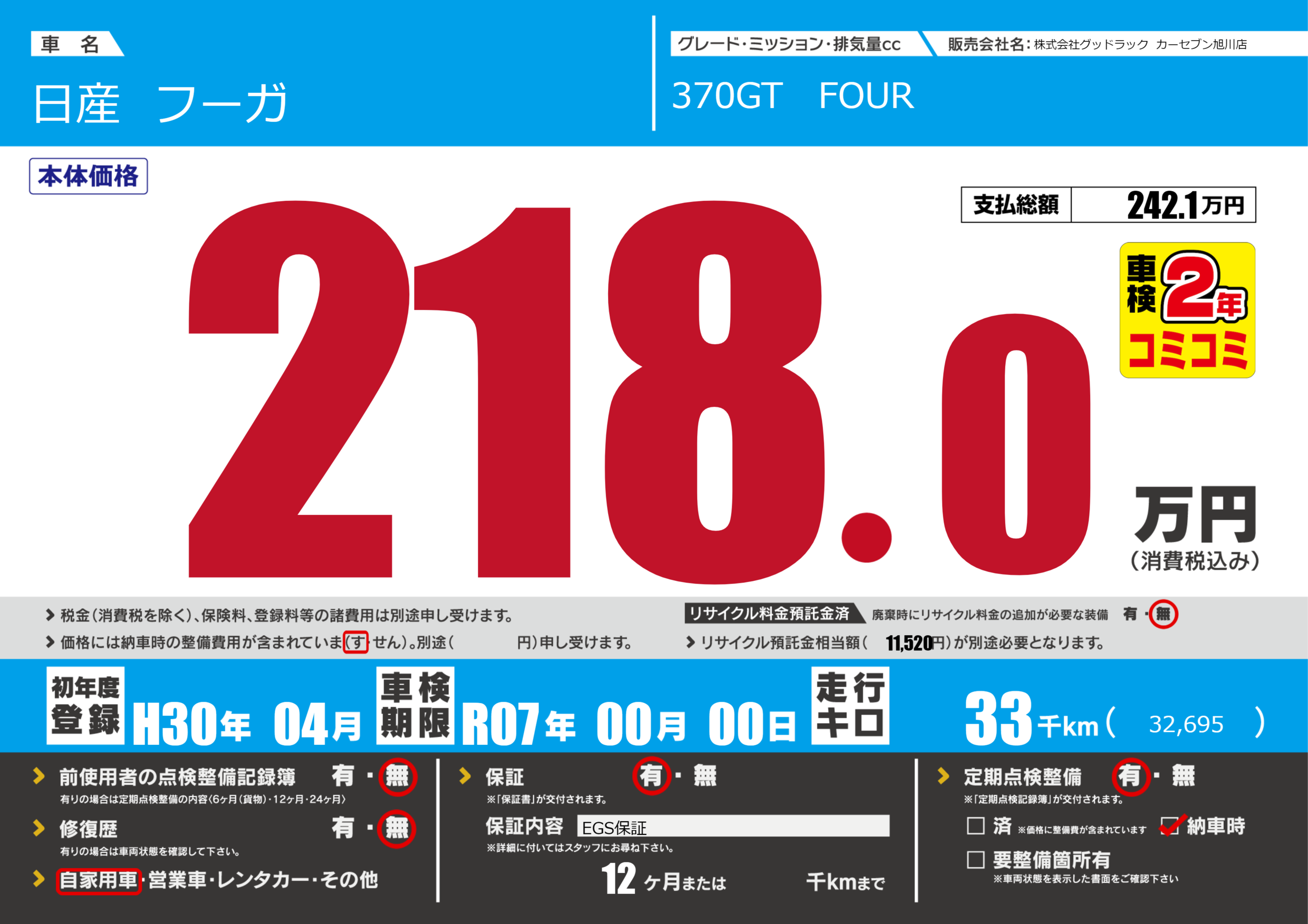 | 走行キロ | 3.3万km | 初年度登録 | H30年04月 |