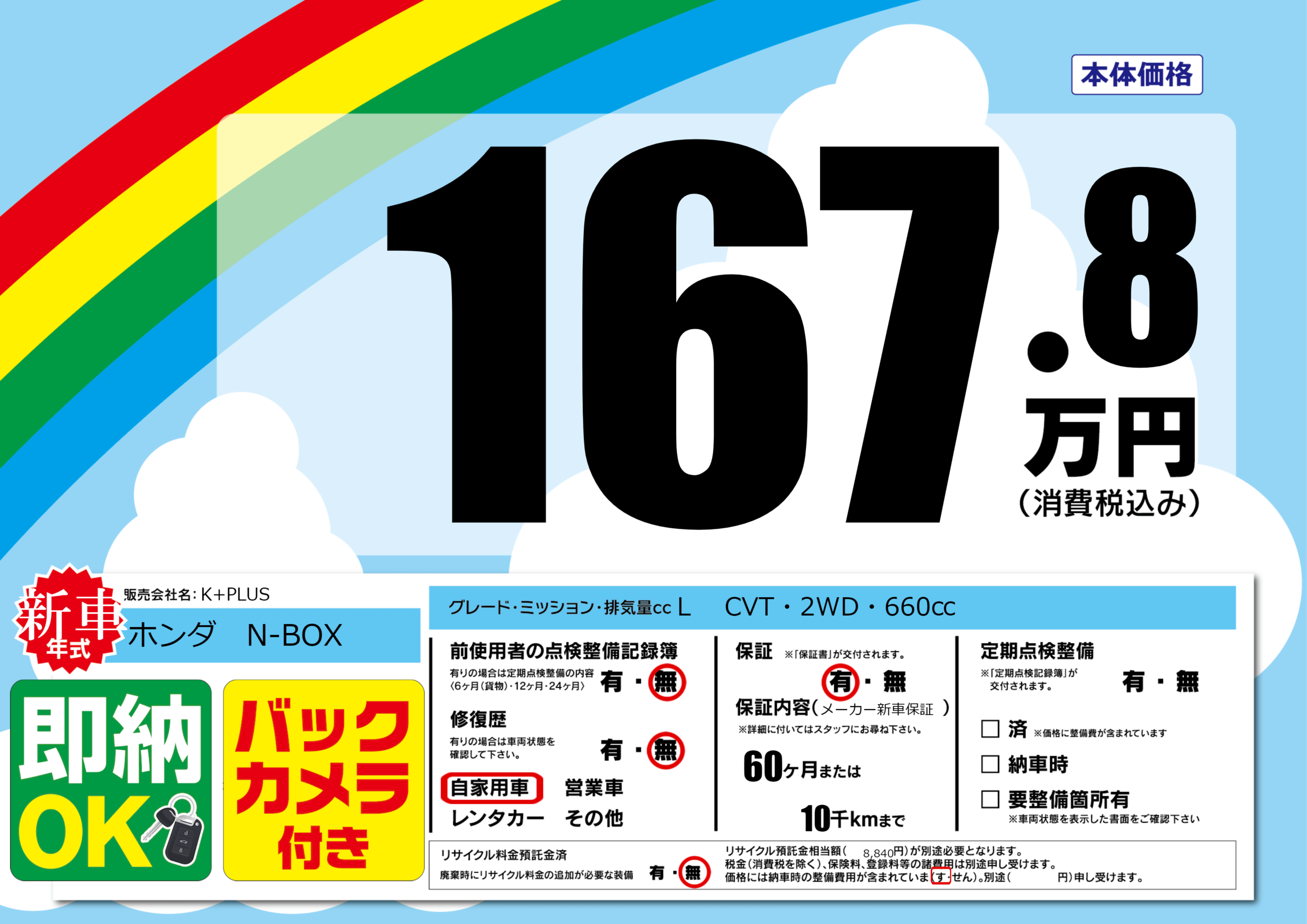 | 車名 | ホンダ N-BOX | グレード ミッション 排気量 |