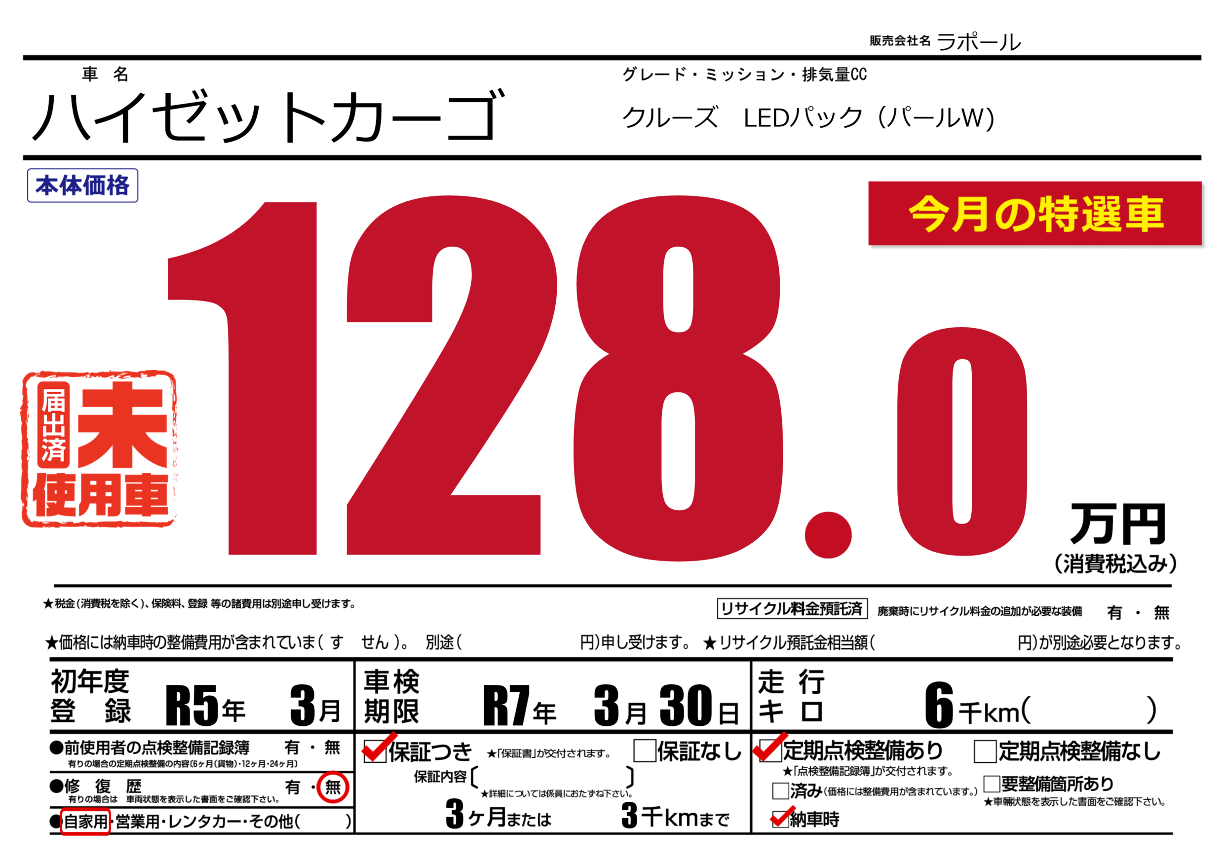 | 走行キロ | 0.6万km | 初年度登録 | R5年3月 |