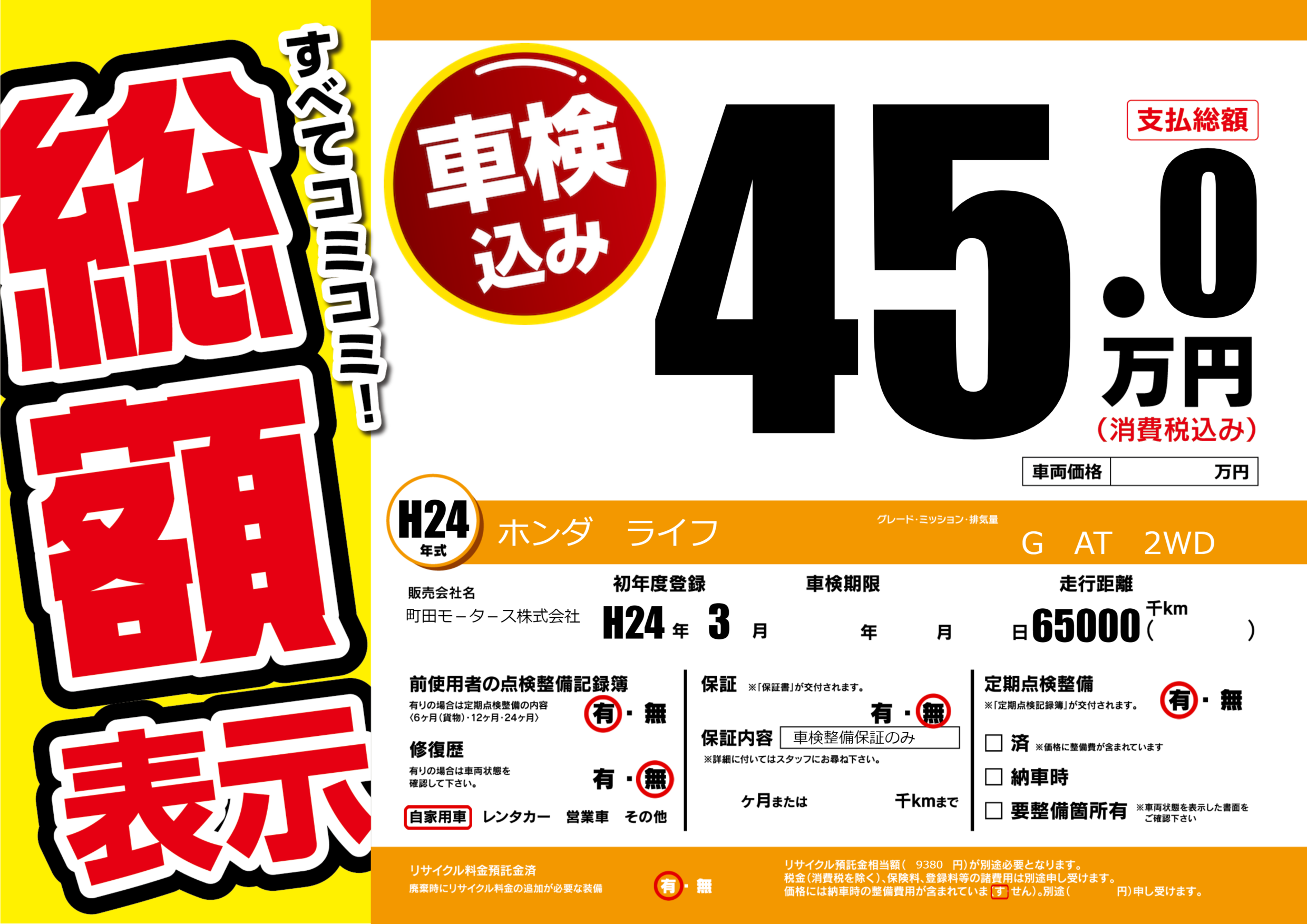 保証なし 保証内容(車検整備保証のみ) ---ヶ月または()千kmまで |