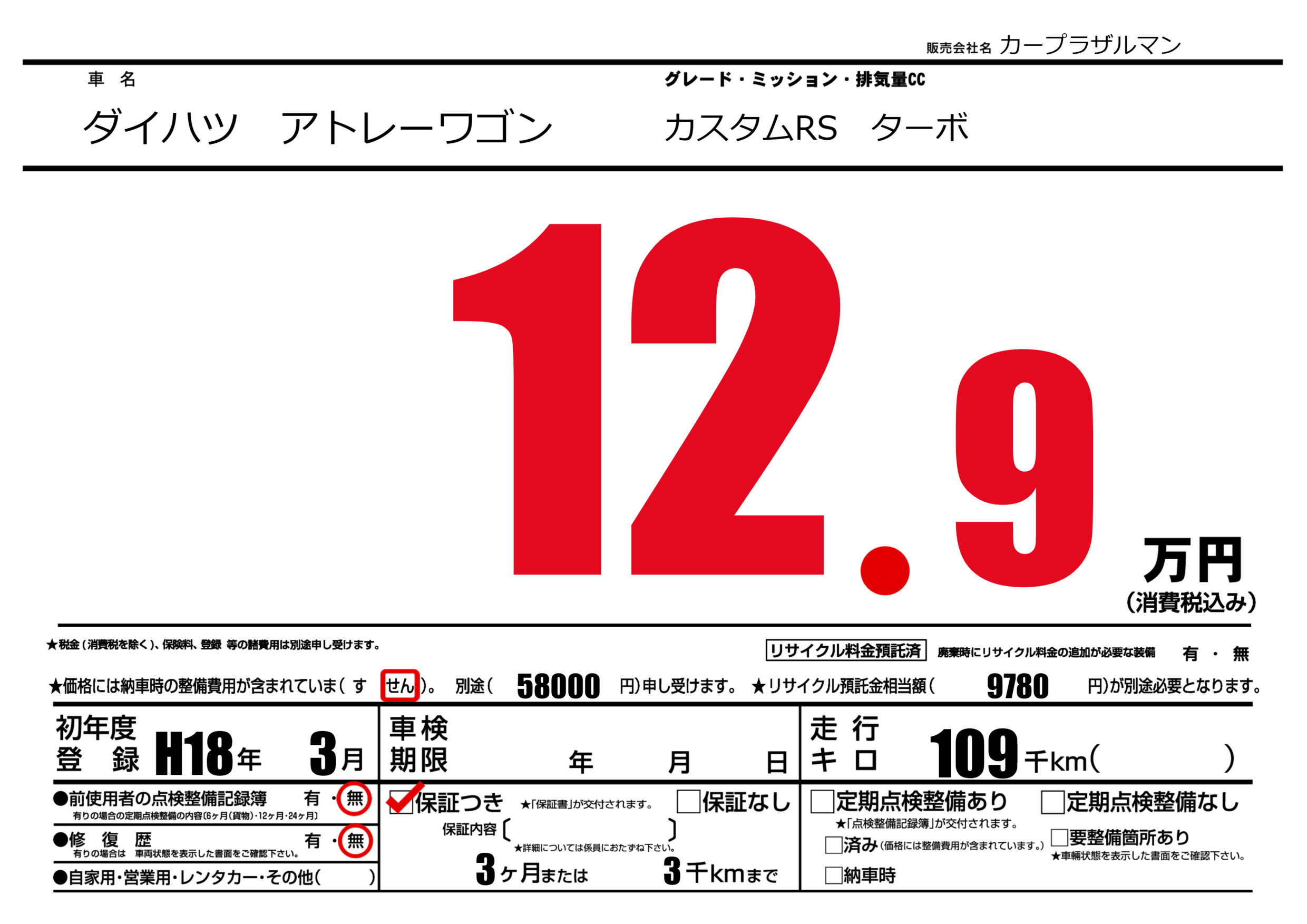 保証付き 保証内容(---) 3ヶ月または(3)千kmまで |
