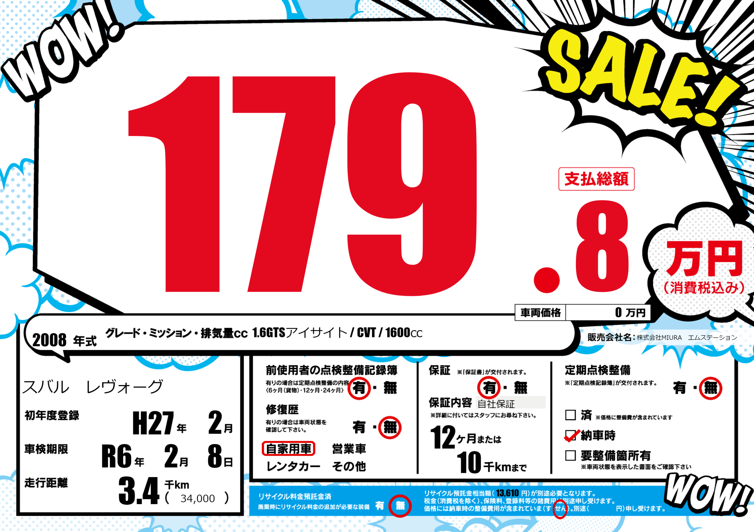 | 車名 | スバル レヴォーグ | グレード ミッション 排気量 |