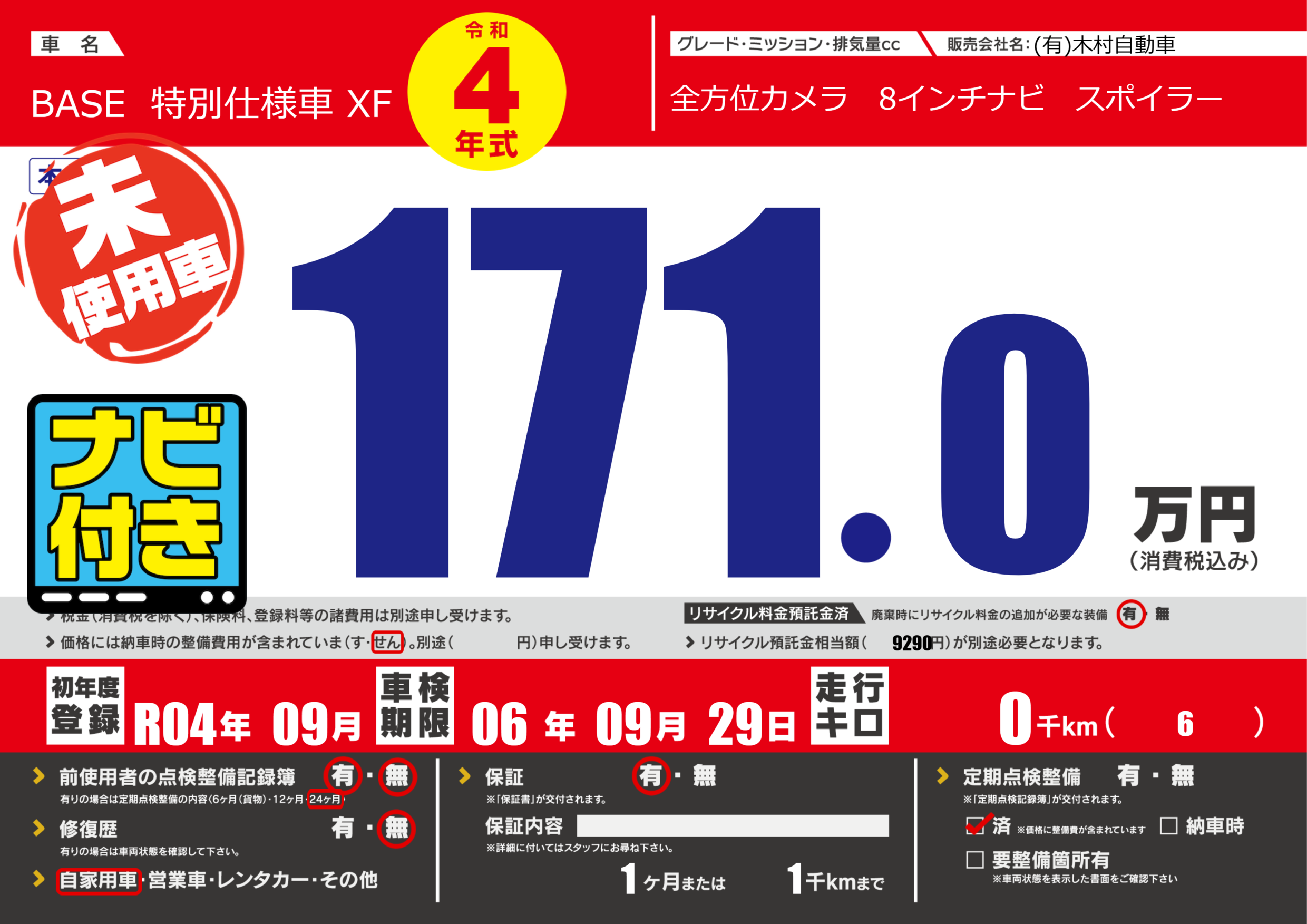 | 車名 | BASE 特別仕様車 XF | グレード ミッション 排気量 |