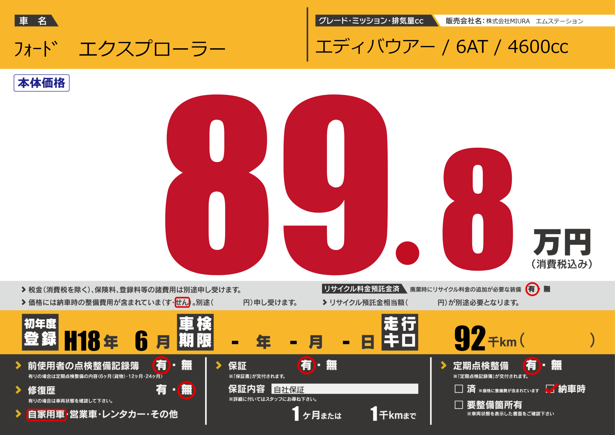 | 車名 | フォード エクスプローラー | グレード ミッション 排気量 |
