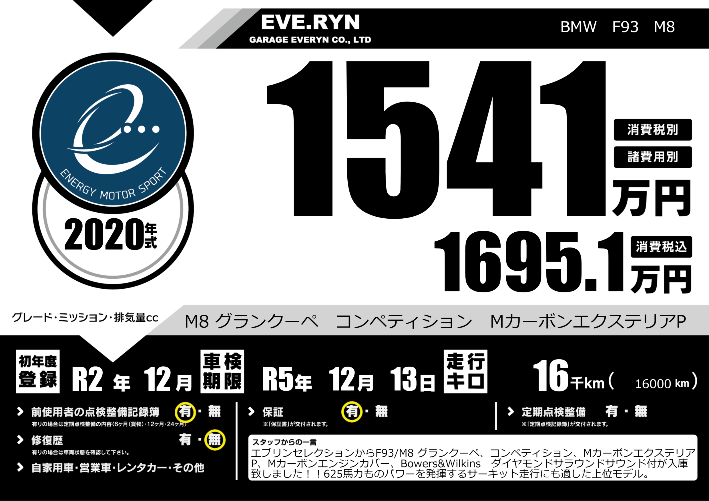 | 車名 | BMW F93 M8 | グレード ミッション 排気量 |