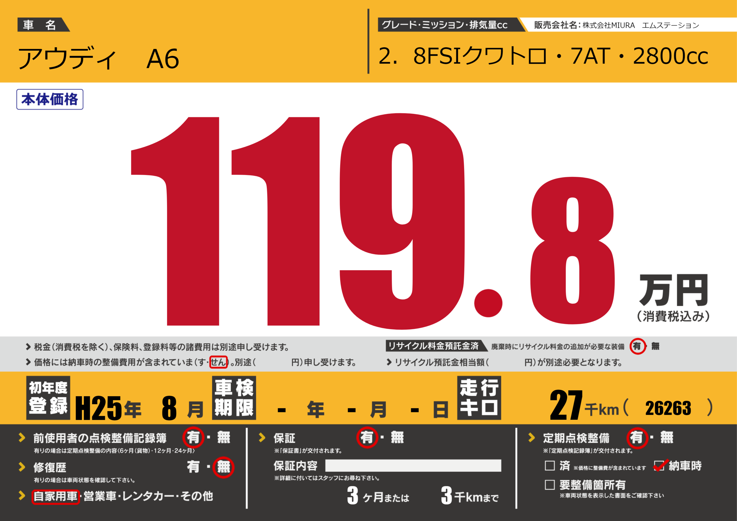 保証付き 保証内容(---) 3ヶ月または(3)千kmまで |