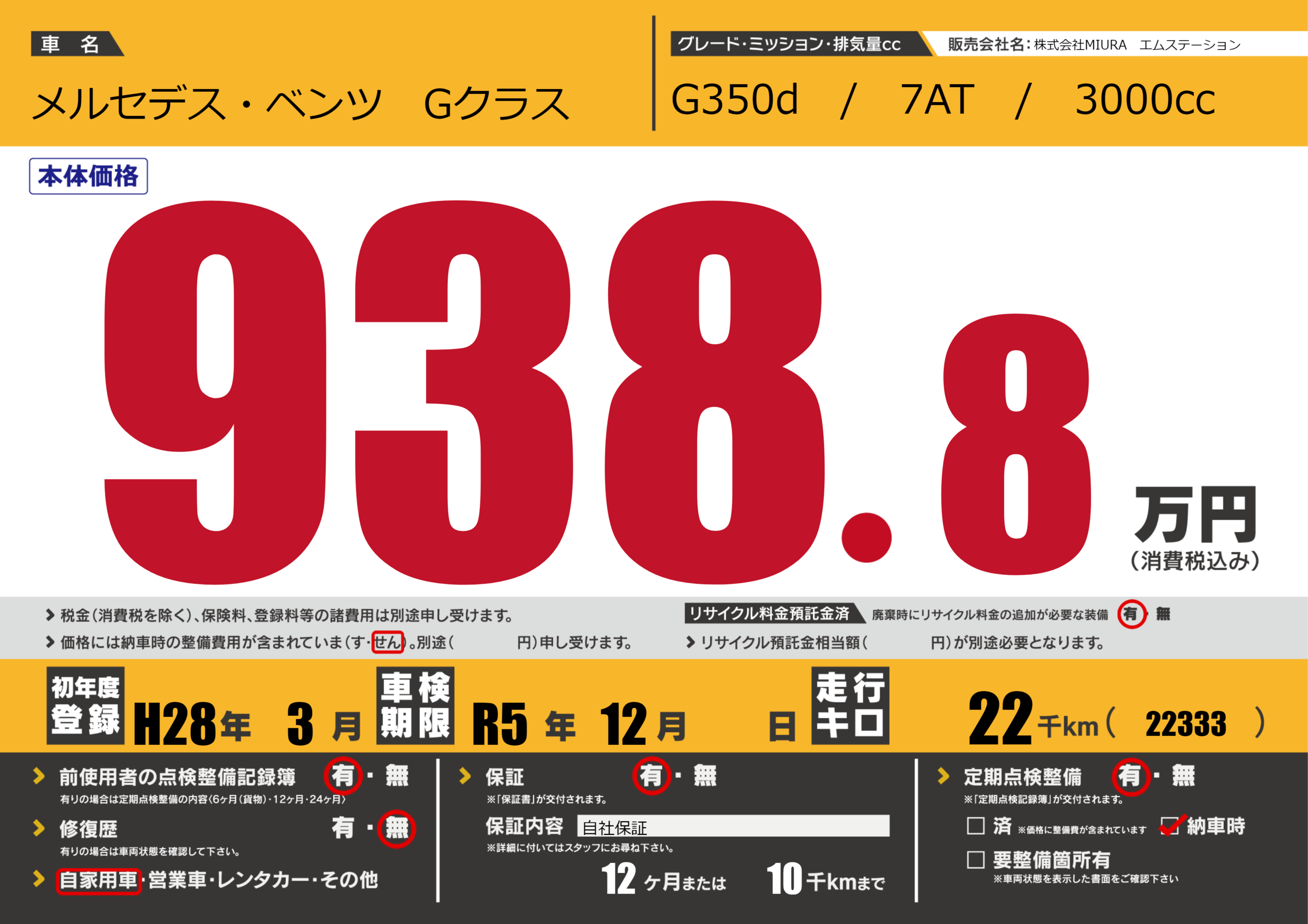 | 車名 | メルセデス・ベンツ Gクラス | グレード ミッション 排気量 |