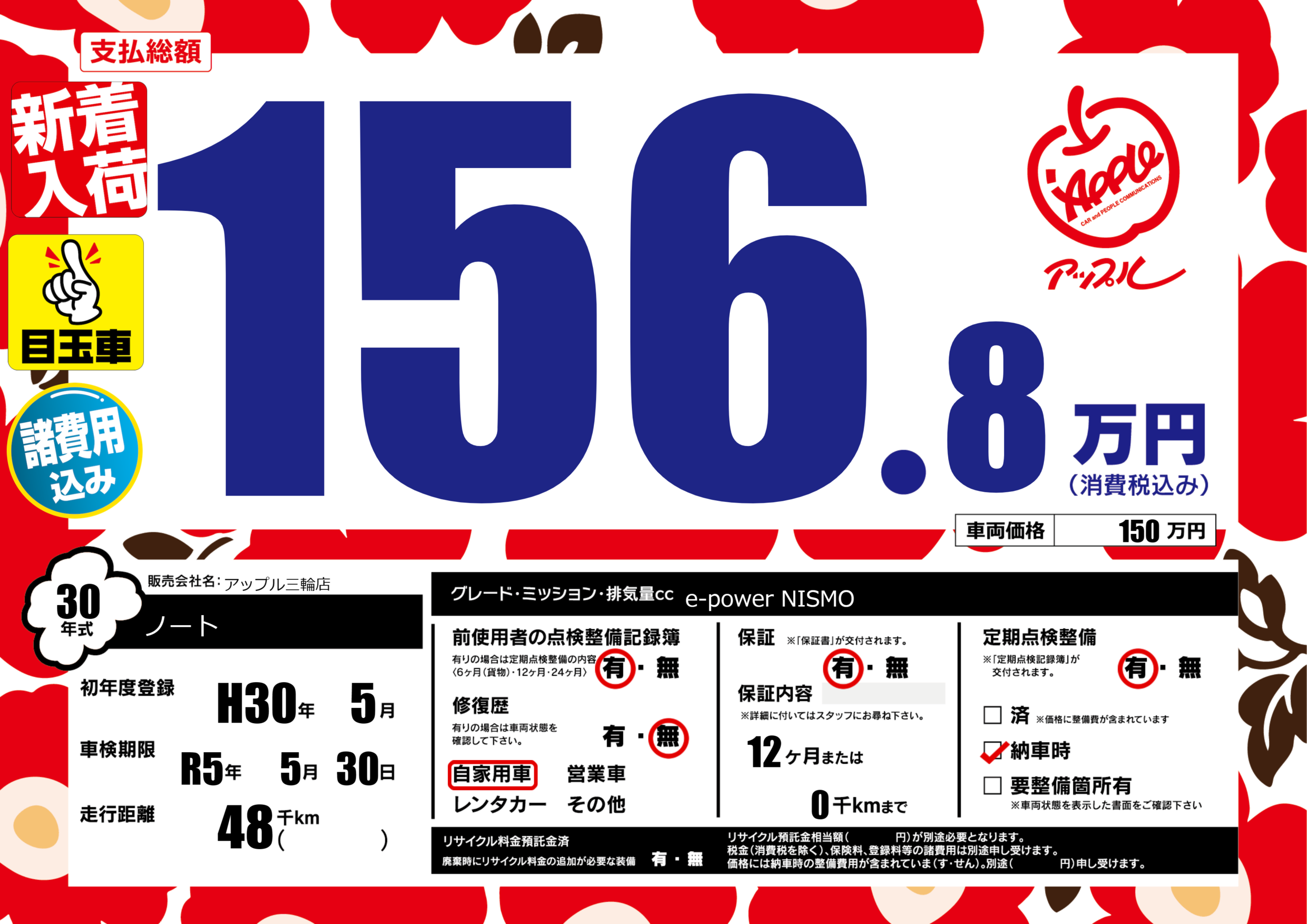 保証付き 保証内容(---) 12ヶ月または(0)千kmまで |