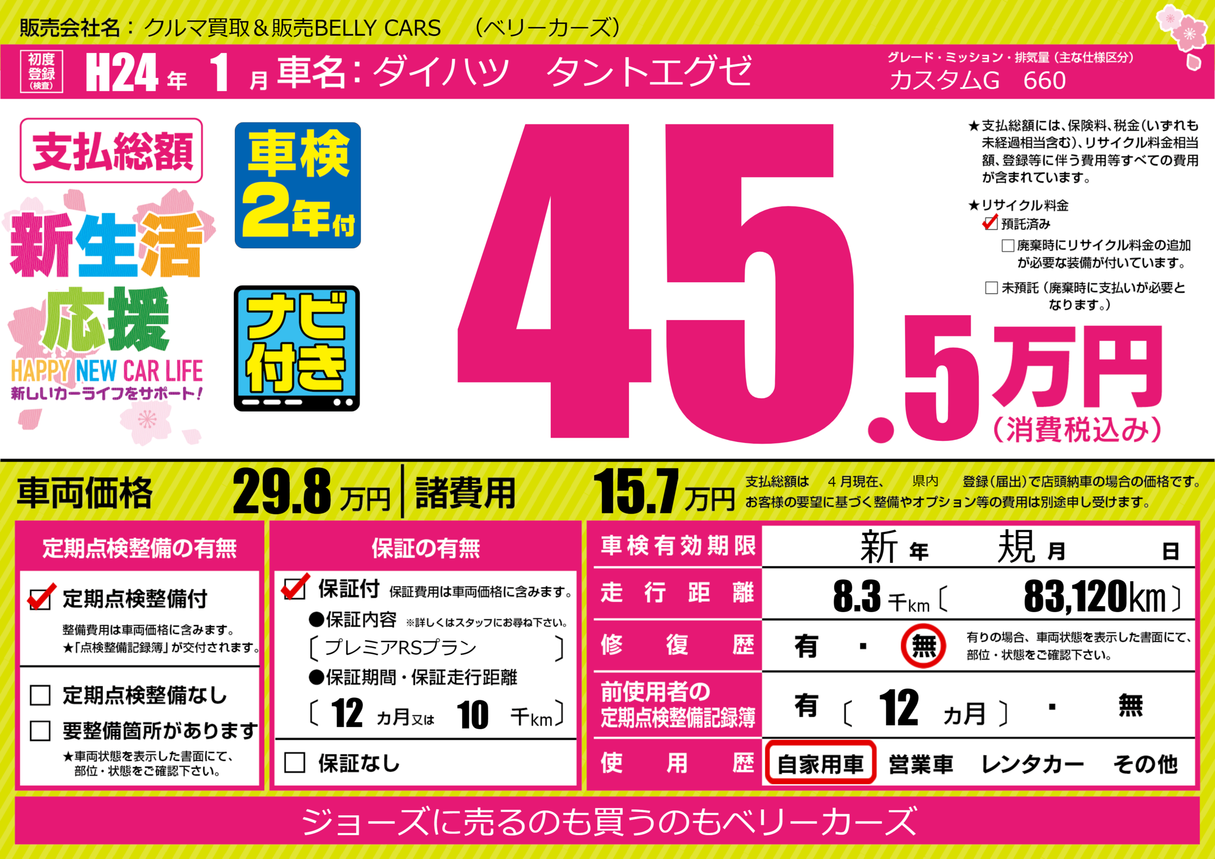 | 走行キロ | 0.8万km | 初年度登録 | H24年1月 |