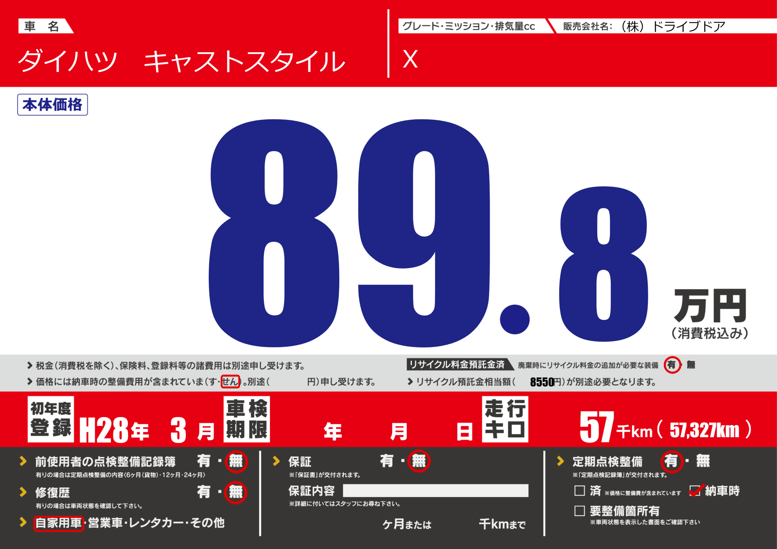 | 定期点検整備 | 定期点検整備あり 納車時あり | ||