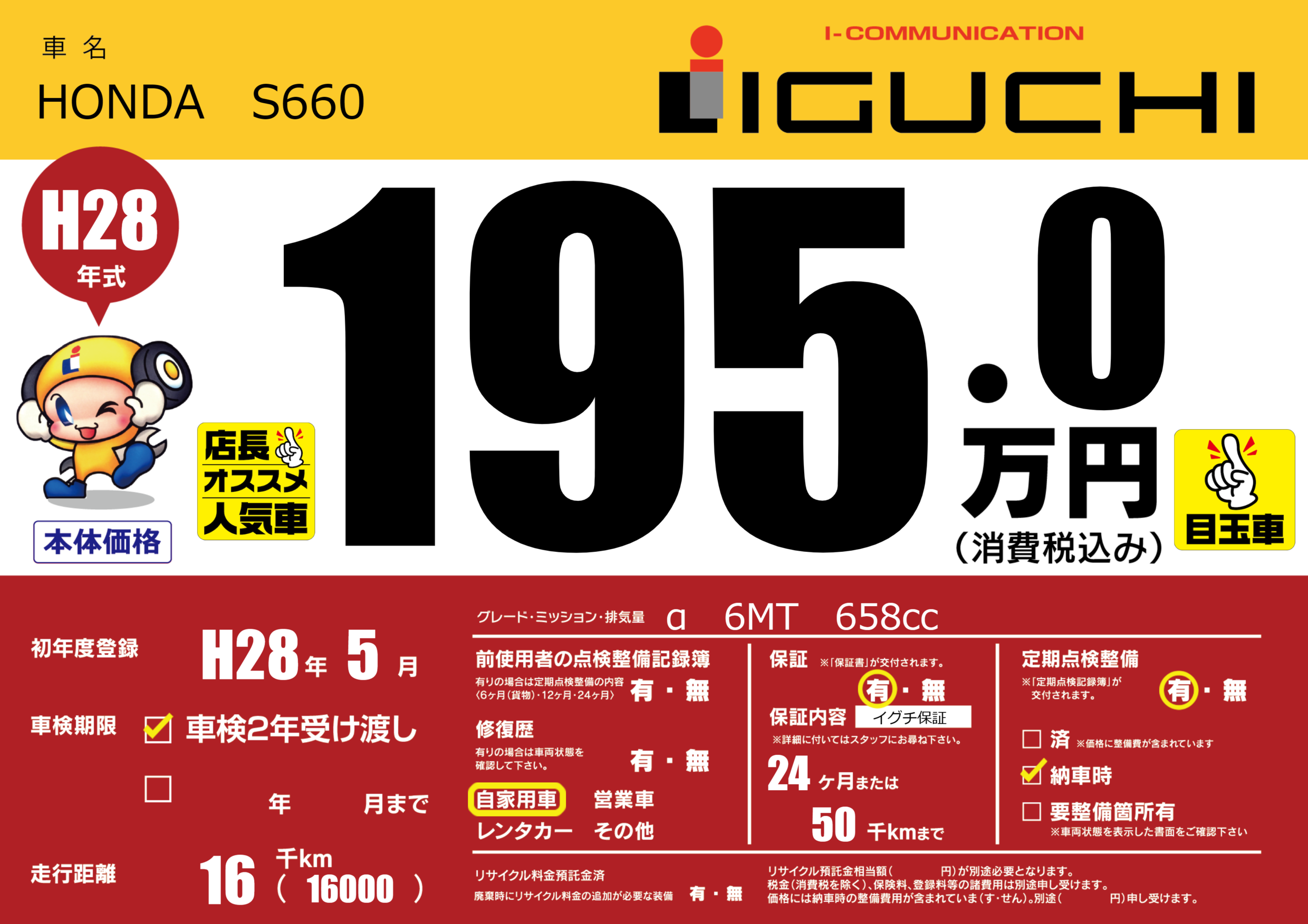 | 車名 | HONDA S660 | グレード ミッション 排気量 |