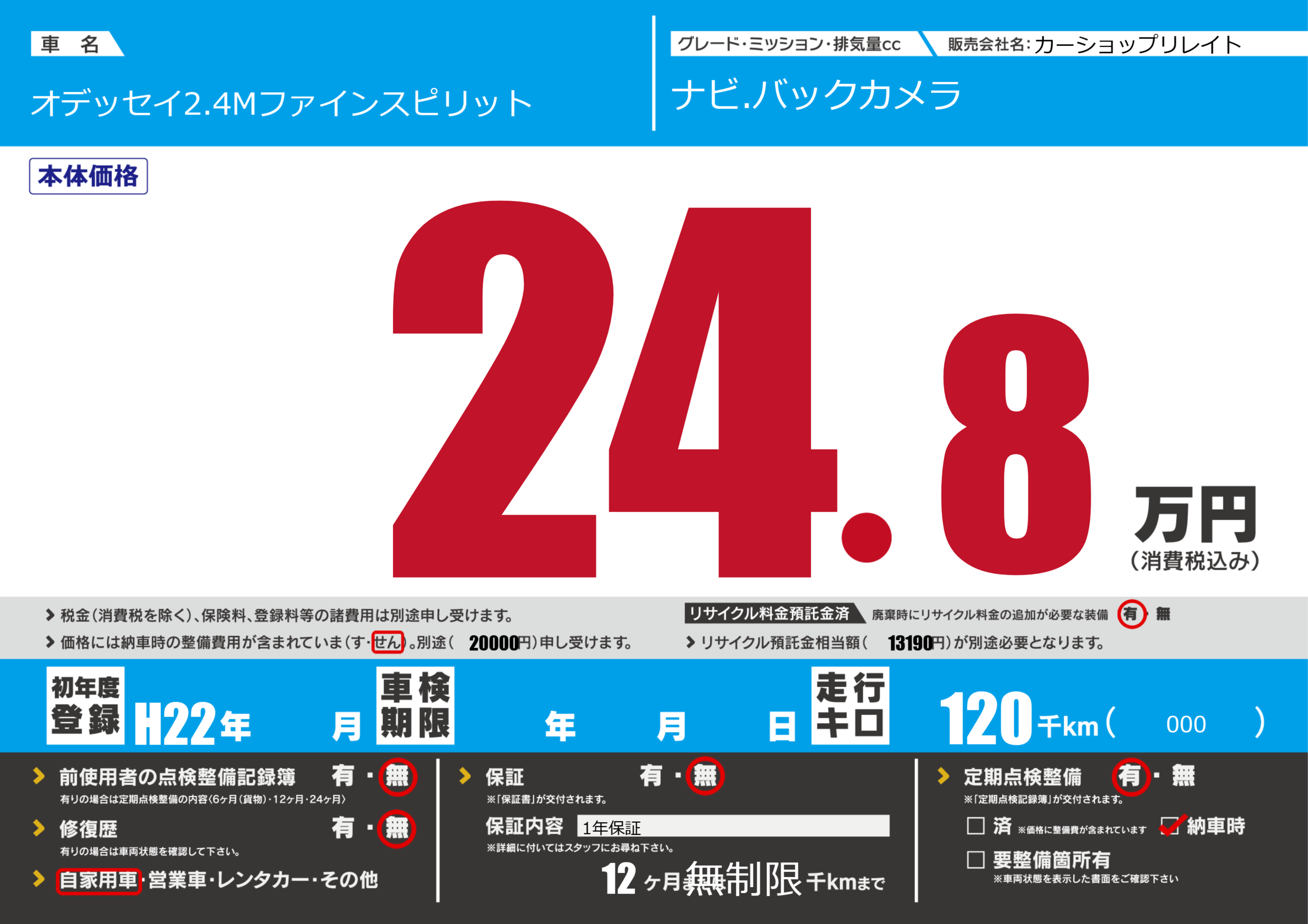 | 定期点検整備 | 定期点検整備あり 納車時あり | ||