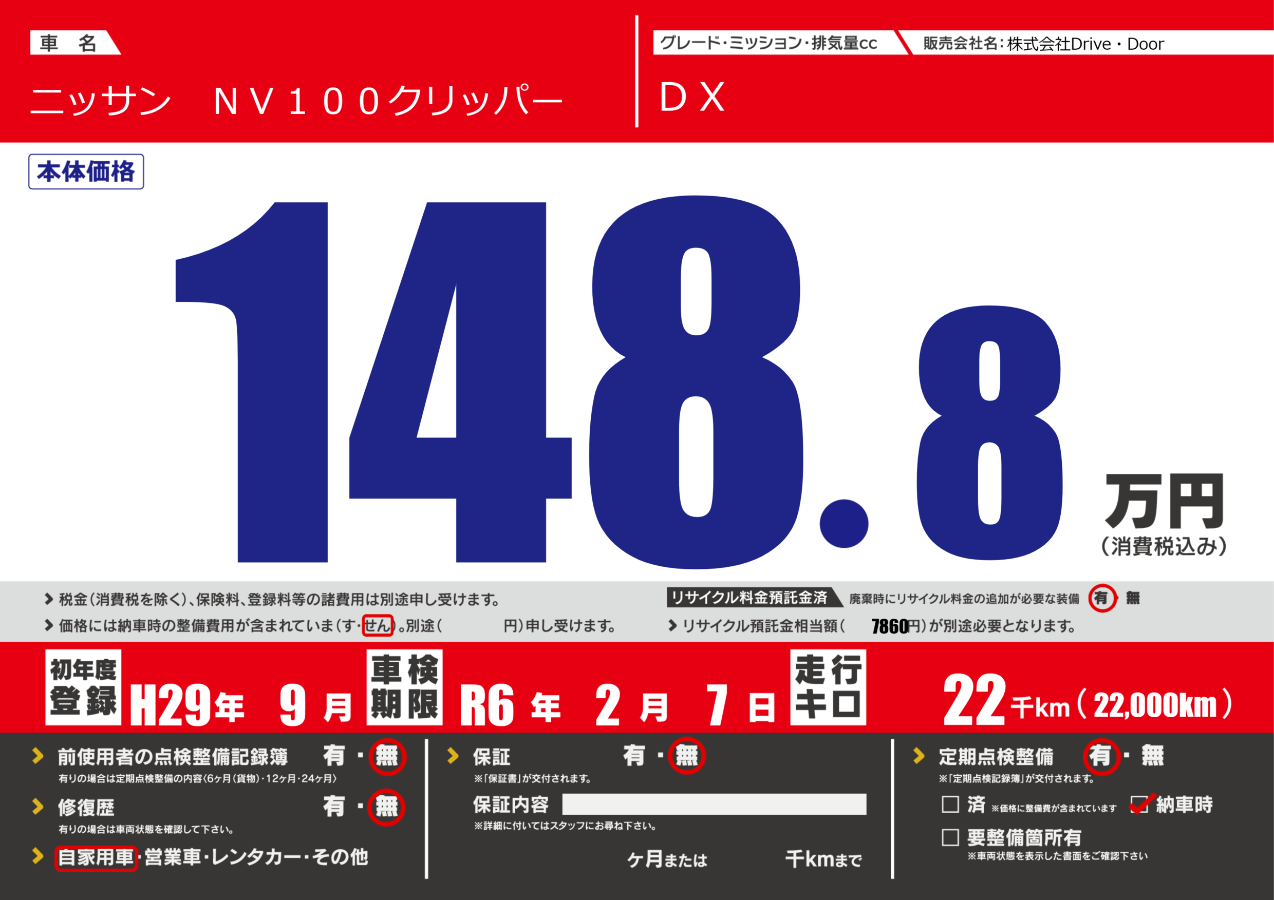 | 定期点検整備 | 定期点検整備あり 納車時あり | ||