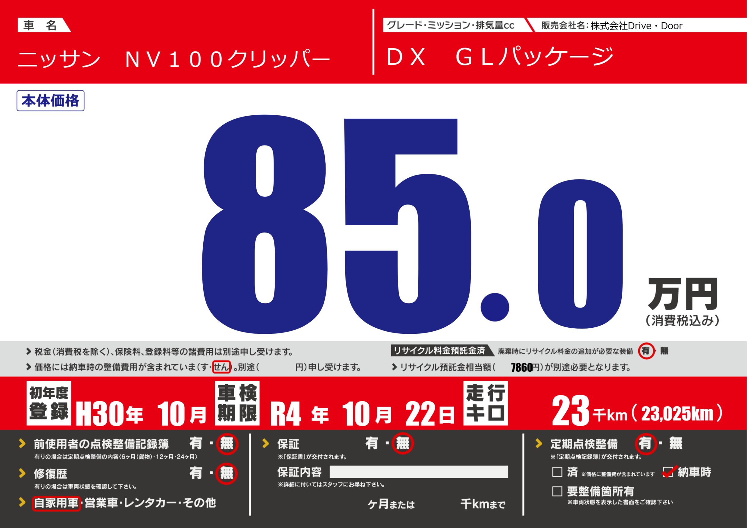 | 車名 | ニッサン NV100クリッパー | グレード ミッション 排気量 |
