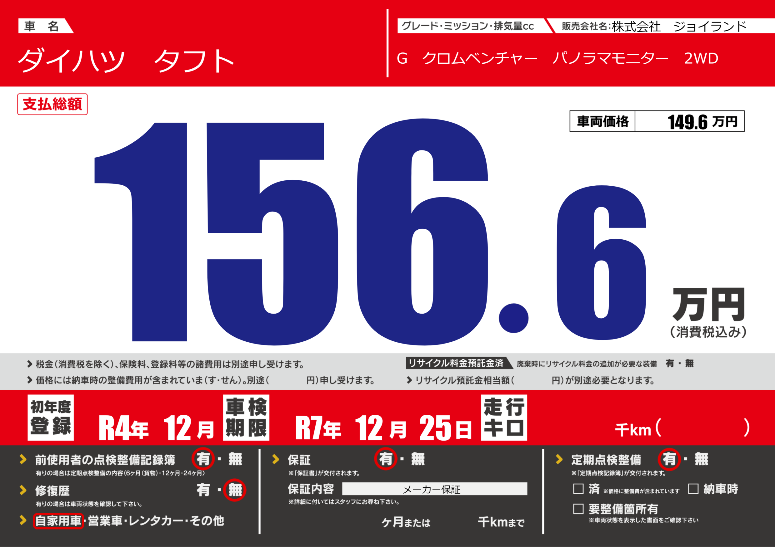 | 走行キロ | - | 初年度登録 | R4年12月 |
