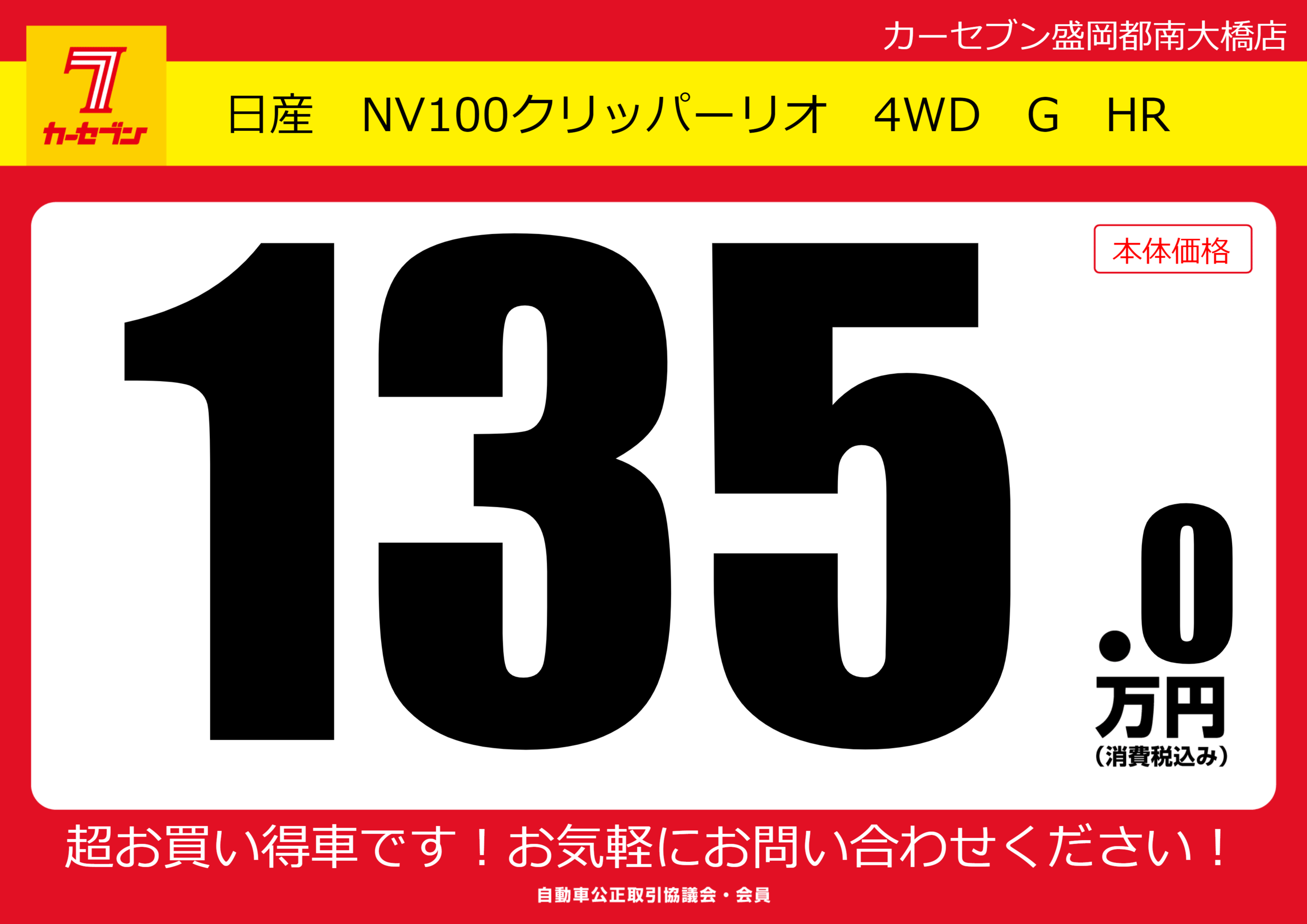 | 車名 | 日産 NV100クリッパーリオ 4WD G HR | グレード ミッション 排気量 |