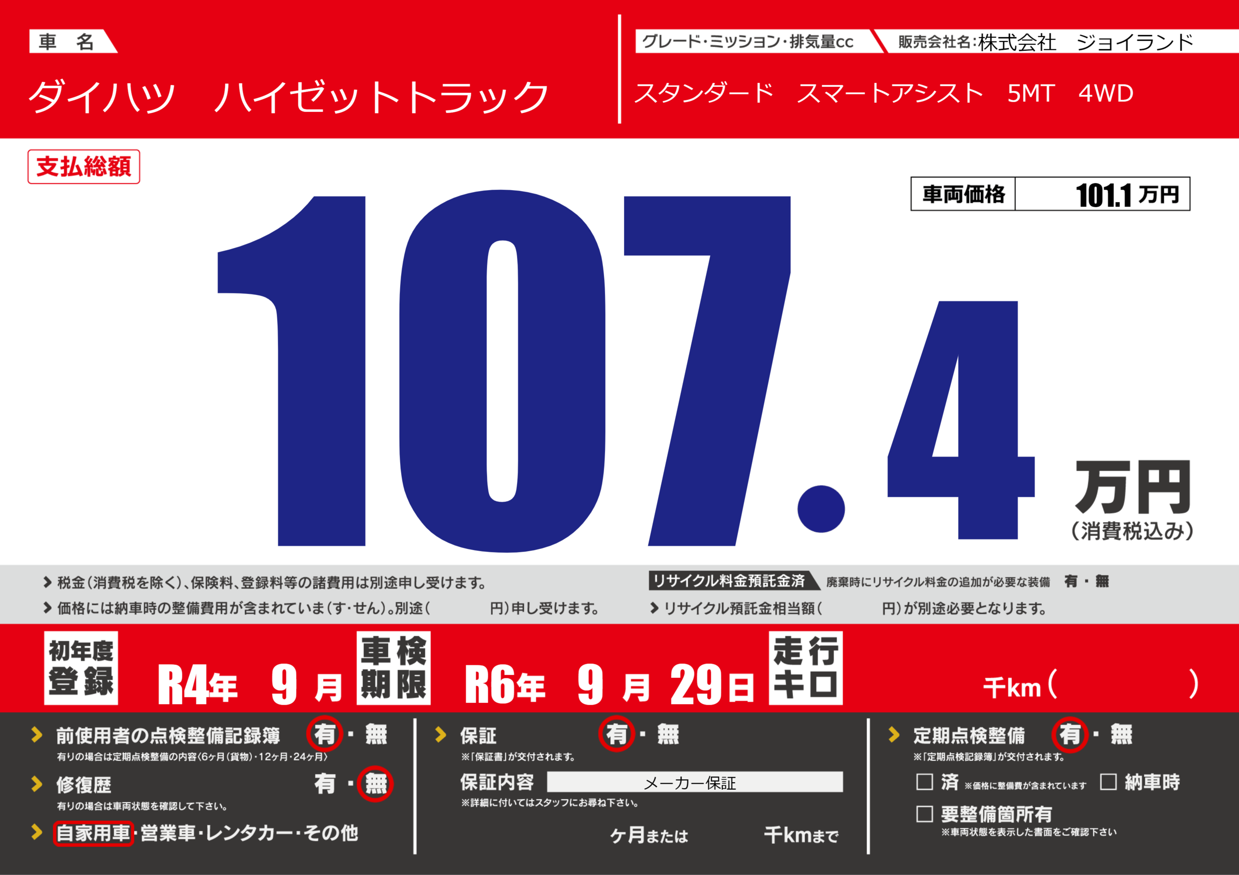 保証付き 保証内容( メーカー保証) ---ヶ月または()千kmまで |