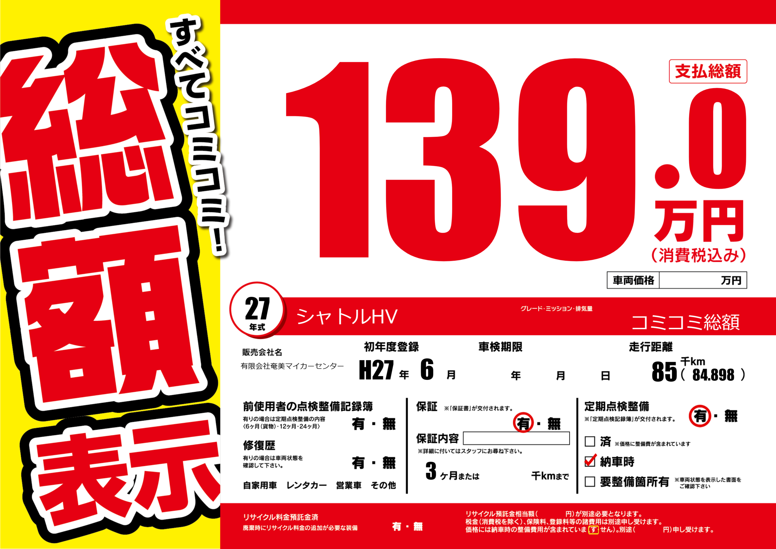 | 定期点検整備 | 定期点検整備あり 納車時あり | ||