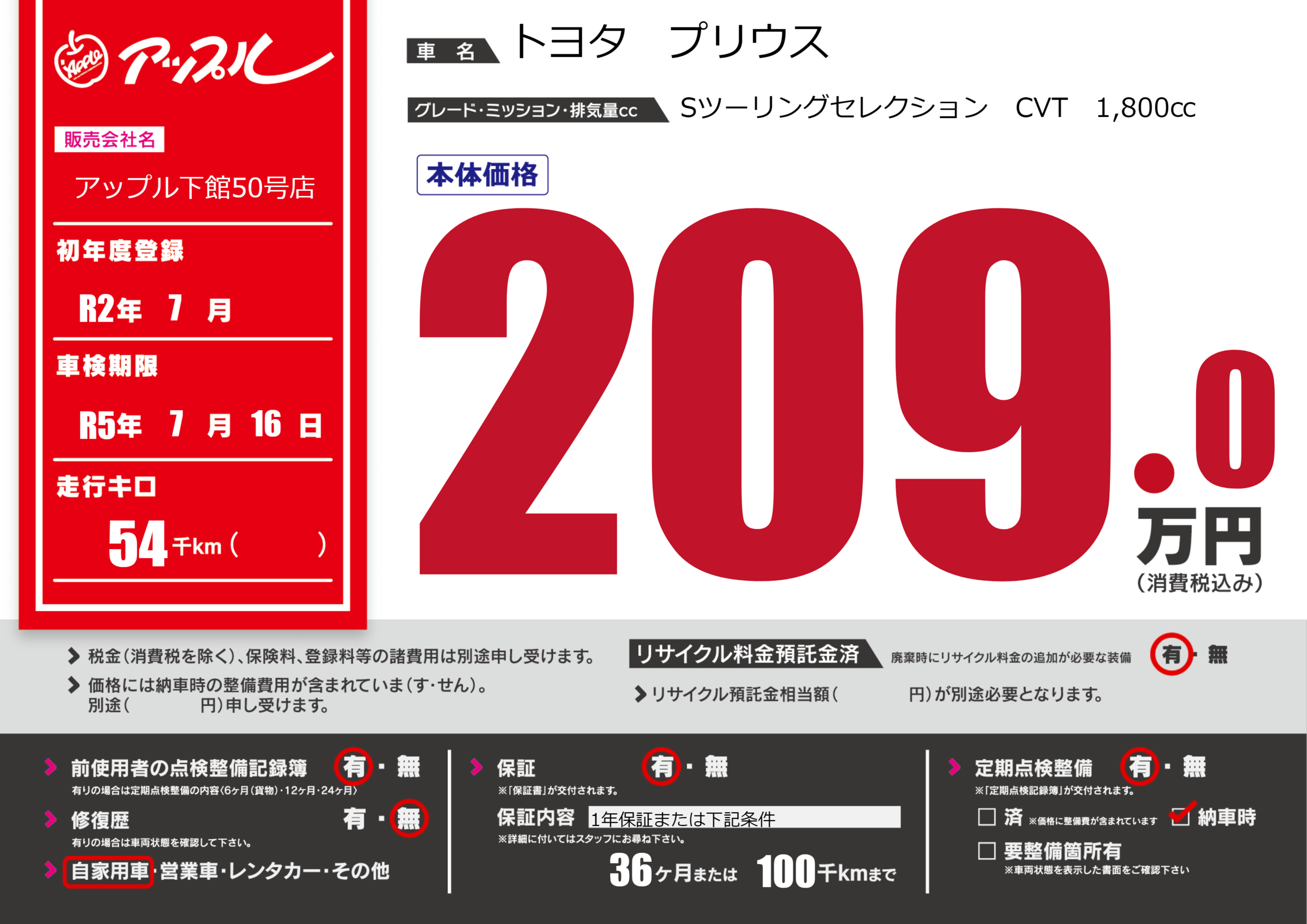 | 車名 | トヨタ プリウス | グレード ミッション 排気量 |