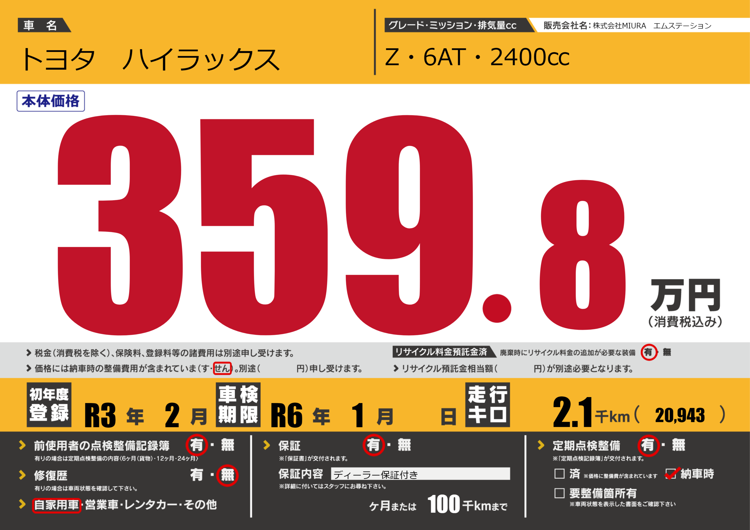 なし | 車検制限 | R6年1月---月 |