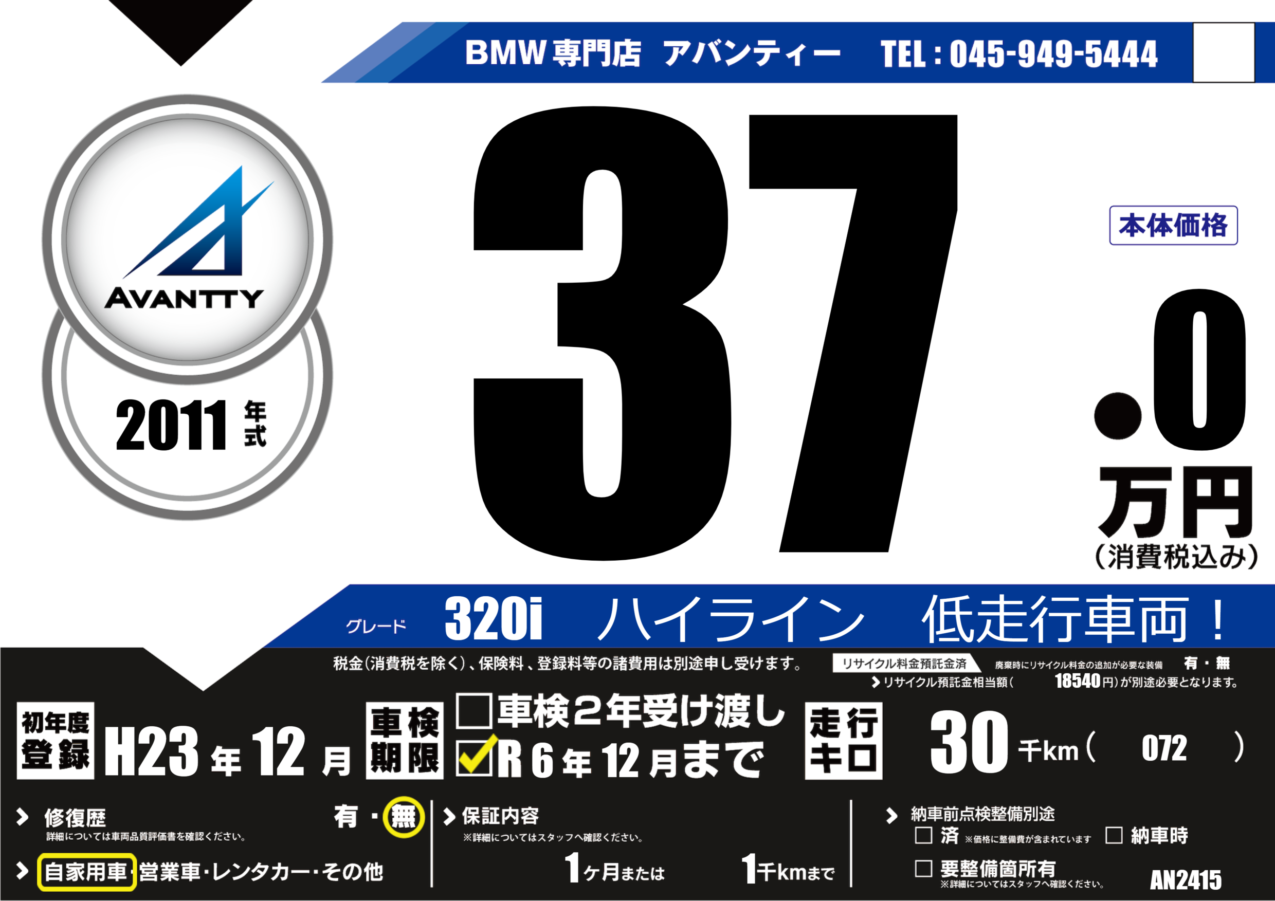 | 走行キロ | 3万km | 初年度登録 | H23年12月 |