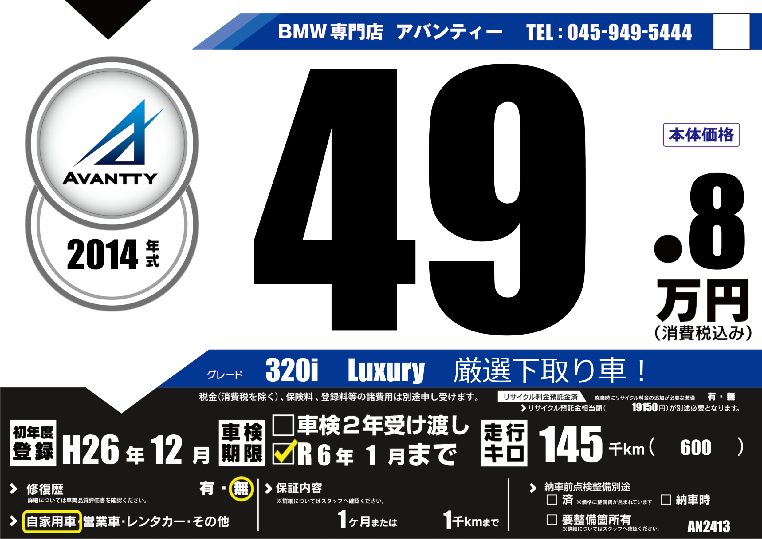 | 走行キロ | 14.5万km | 初年度登録 | H26年12月 |