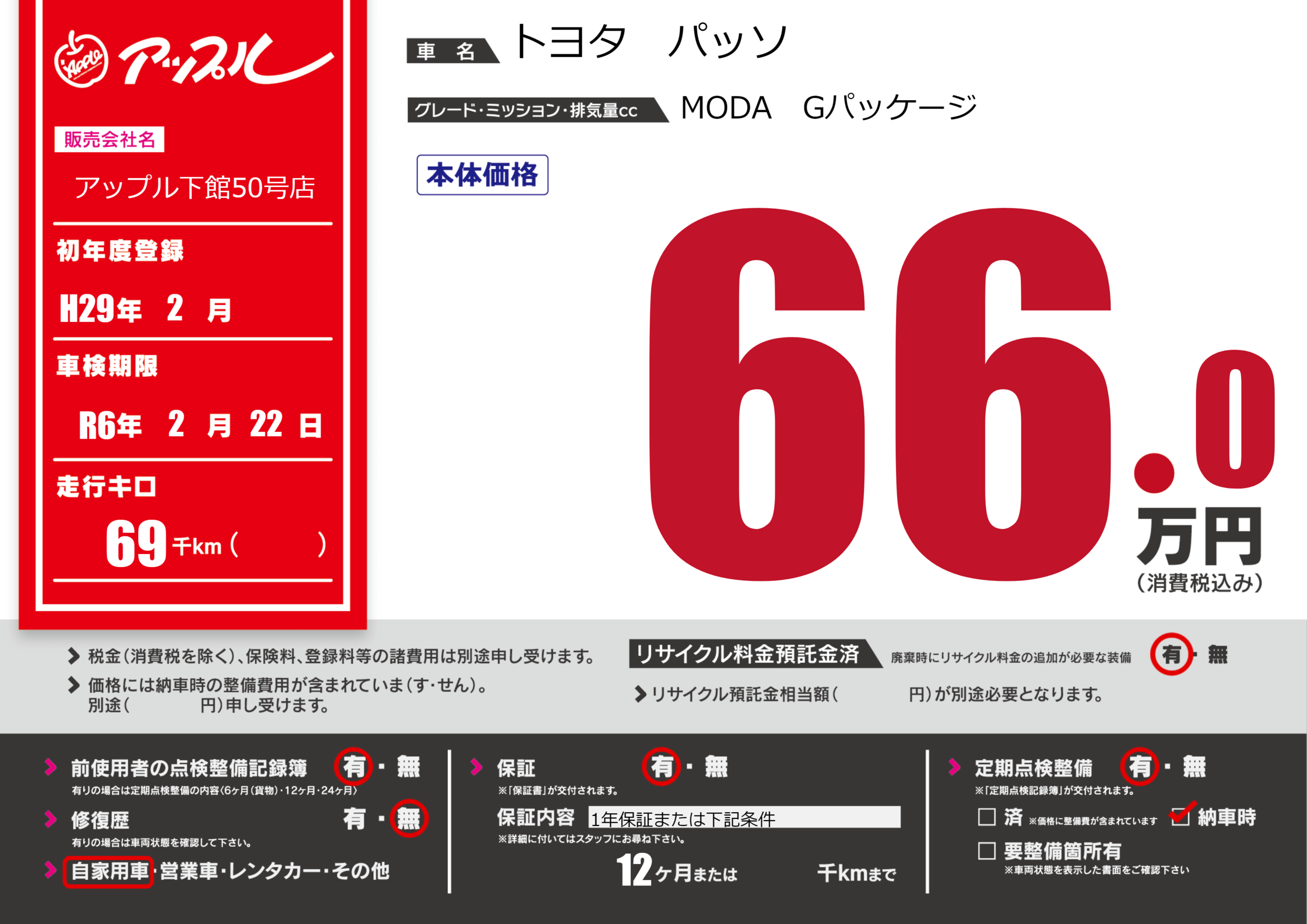 | 車名 | トヨタ パッソ | グレード ミッション 排気量 |