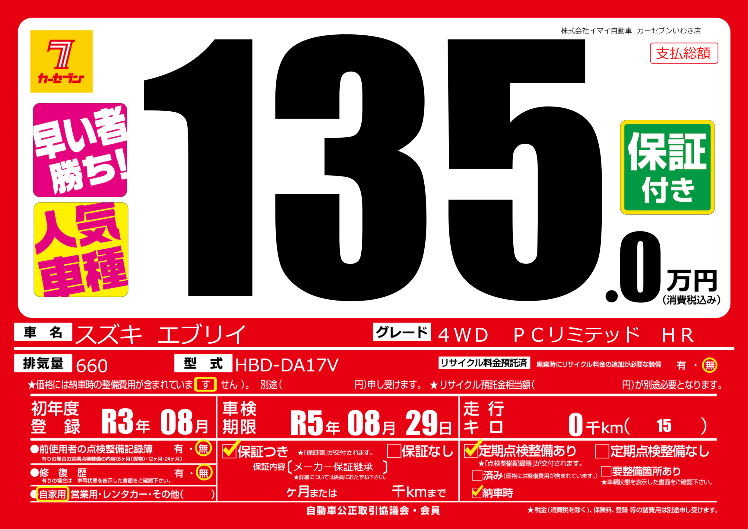 | 車名 | スズキ エブリイ | グレード ミッション 排気量 |