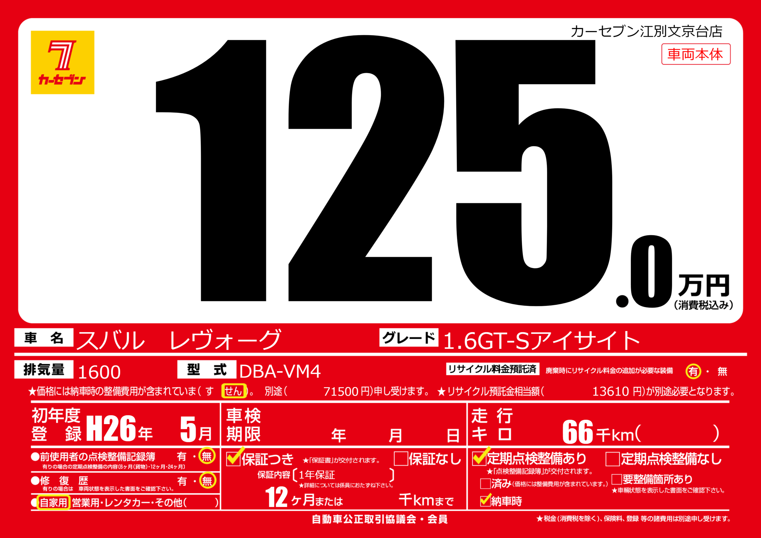 | 車名 | スバル レヴォーグ | グレード ミッション 排気量 |