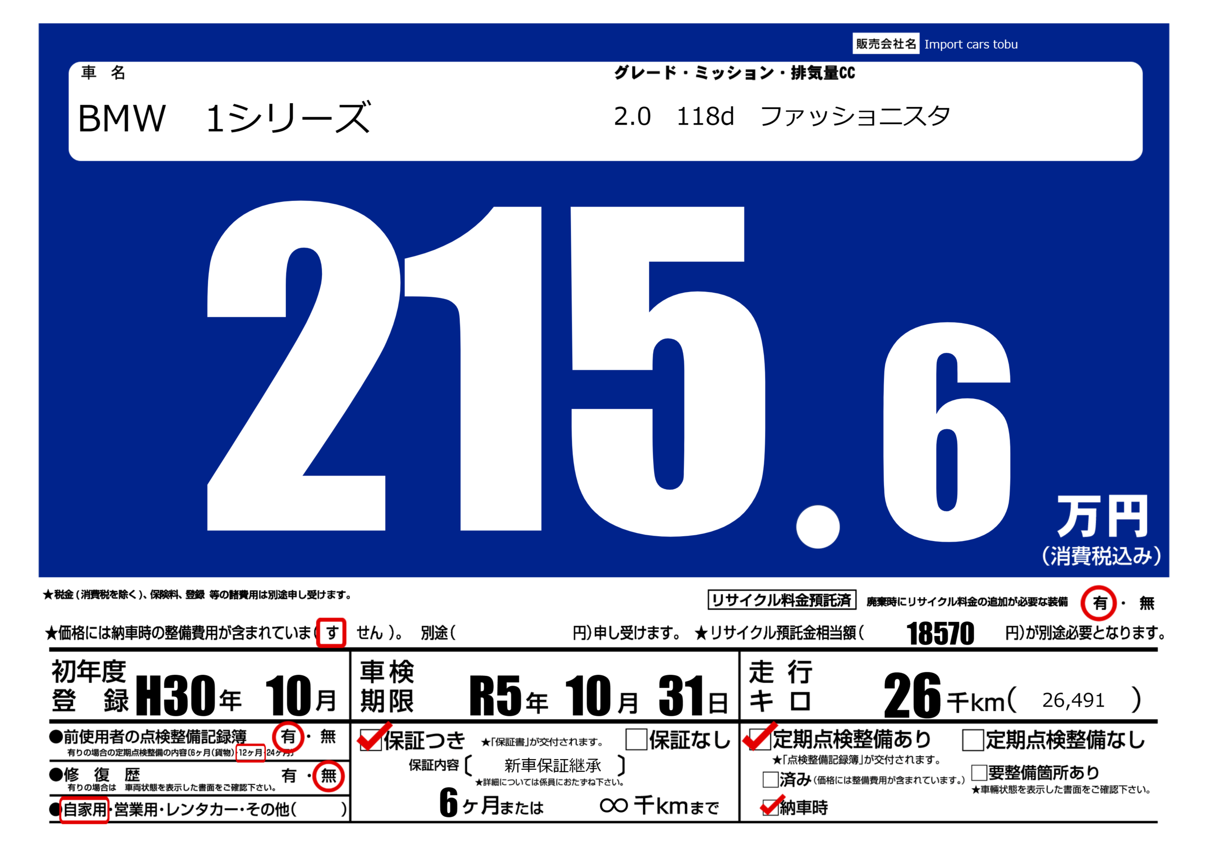 保証付き 保証内容( 新車保証継承) 6ヶ月または(∞)千kmまで |