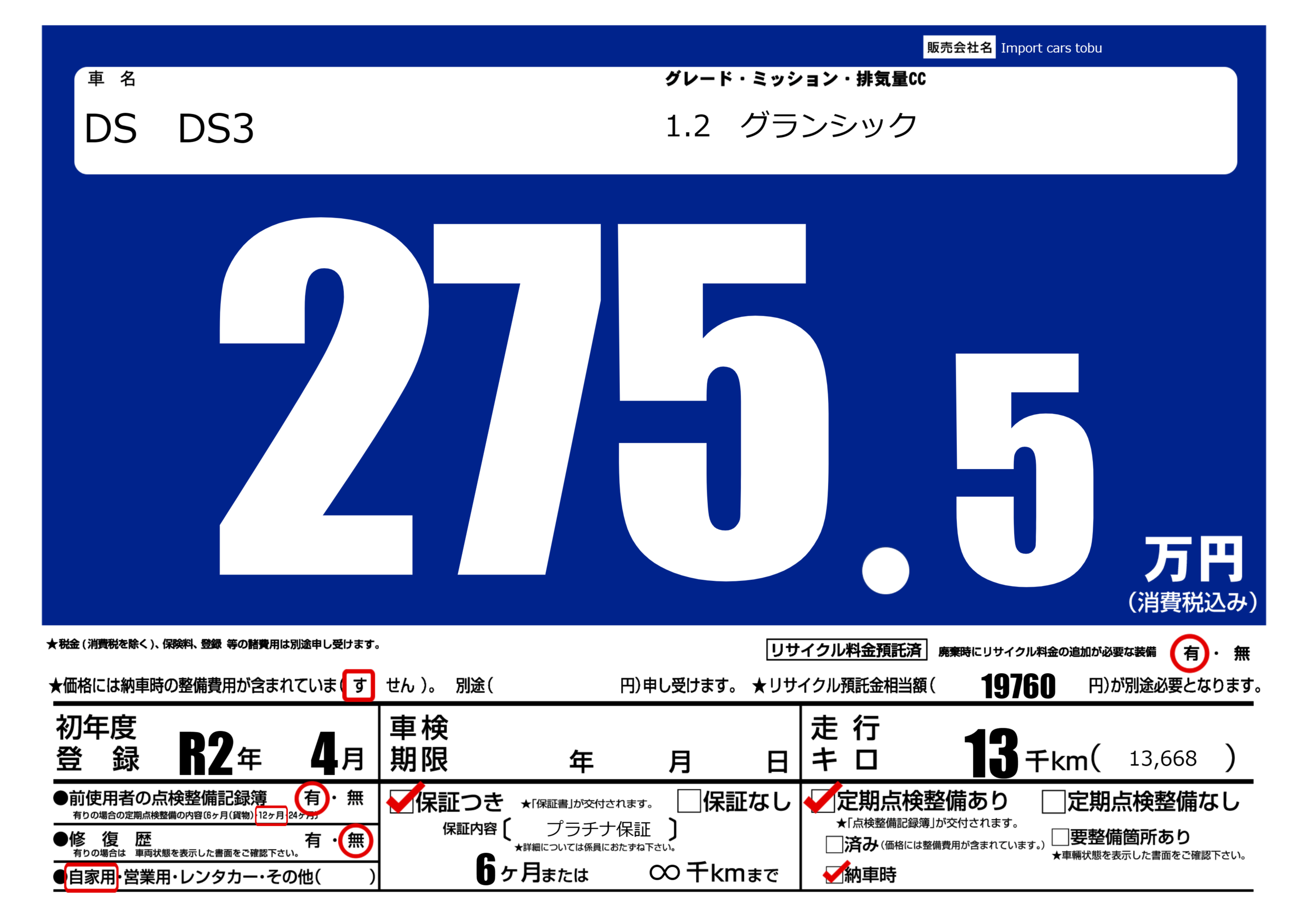 | 車名 | DS DS3 | グレード ミッション 排気量 |