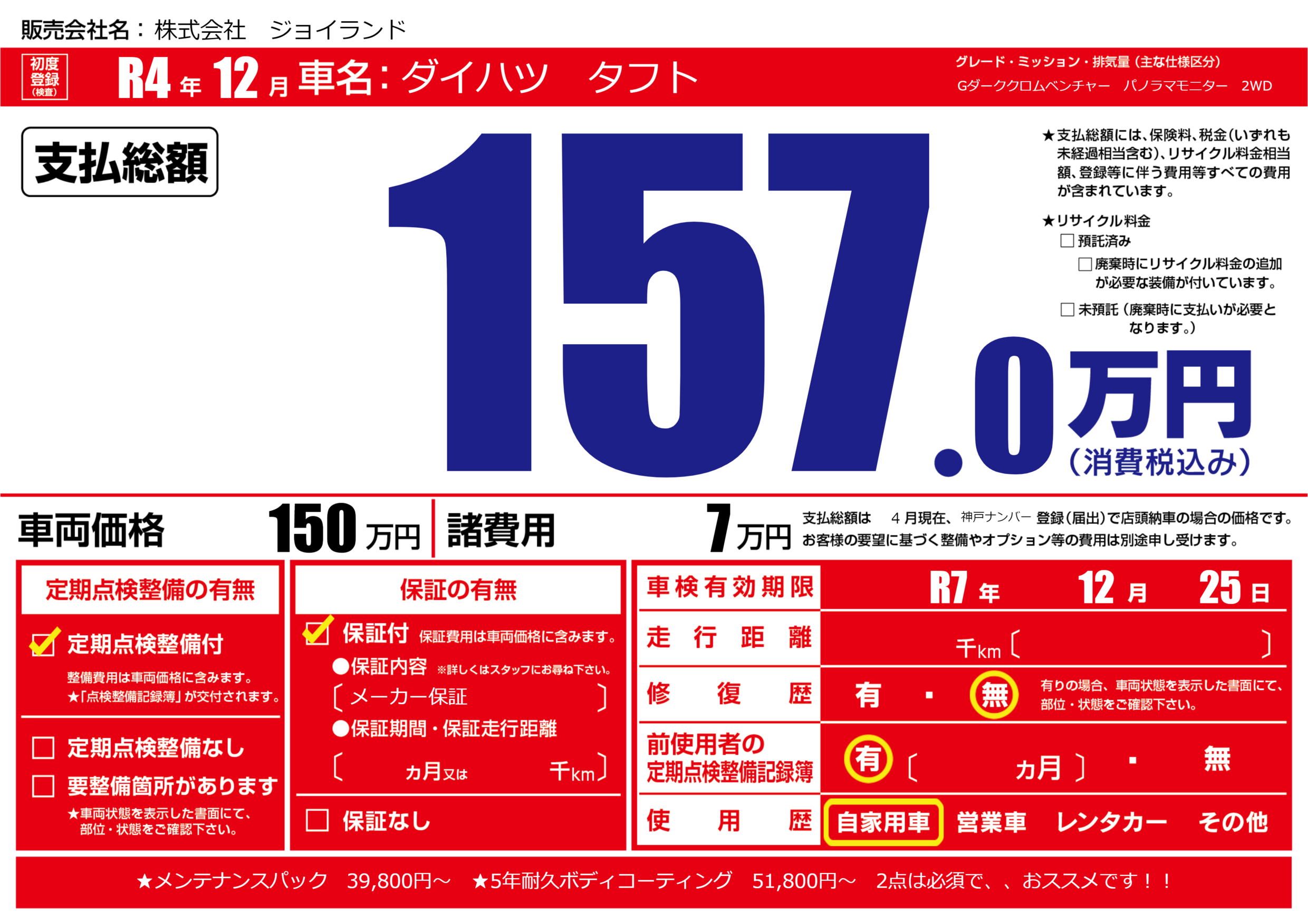 | 走行キロ | - | 初年度登録 | R4年12月 |
