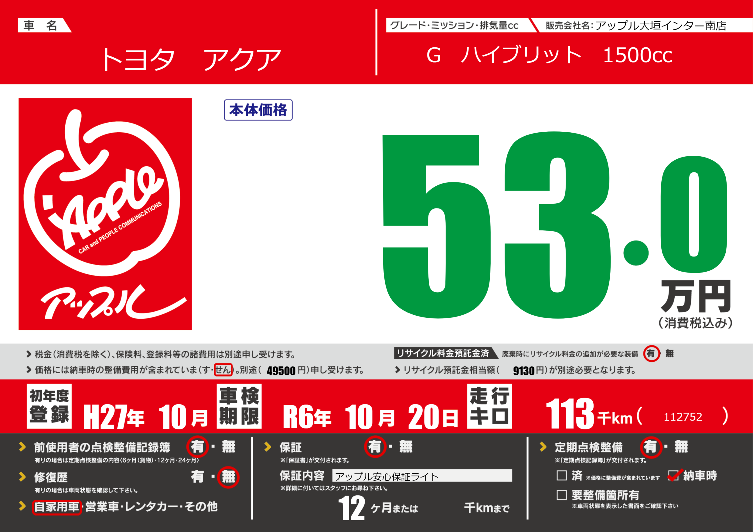 保証付き 保証内容(アップル安心保証ライト) 12ヶ月または()千kmまで |