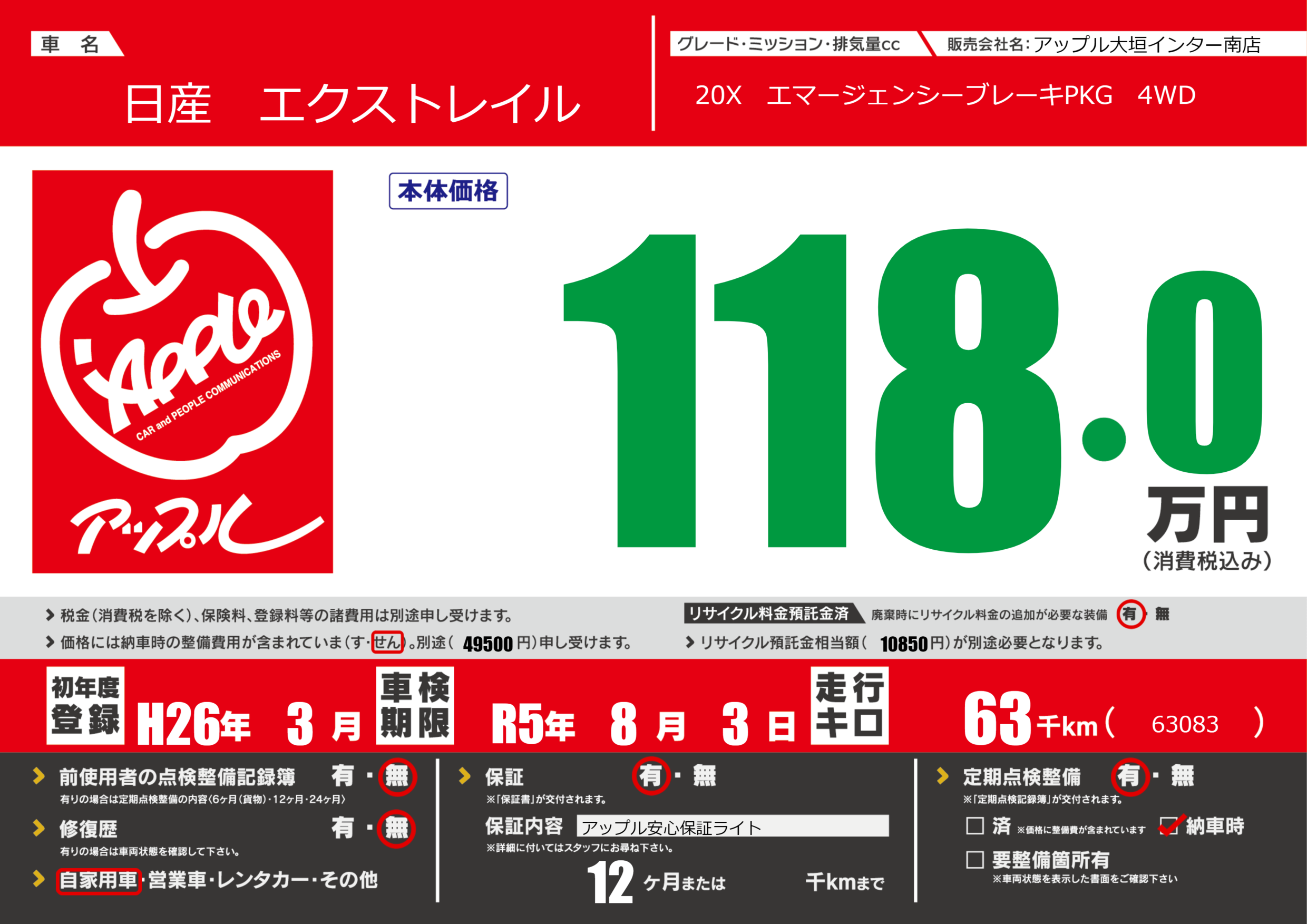 | 車名 | 日産 エクストレイル | グレード ミッション 排気量 |
