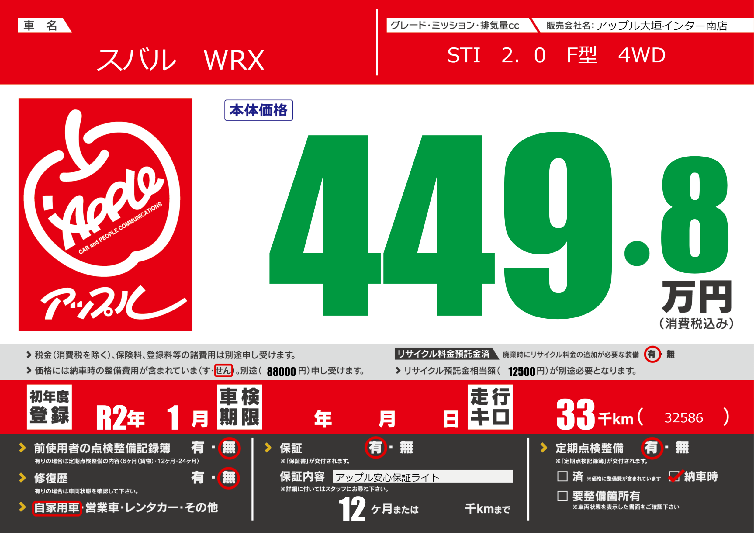保証付き 保証内容(アップル安心保証ライト) 12ヶ月または()千kmまで |