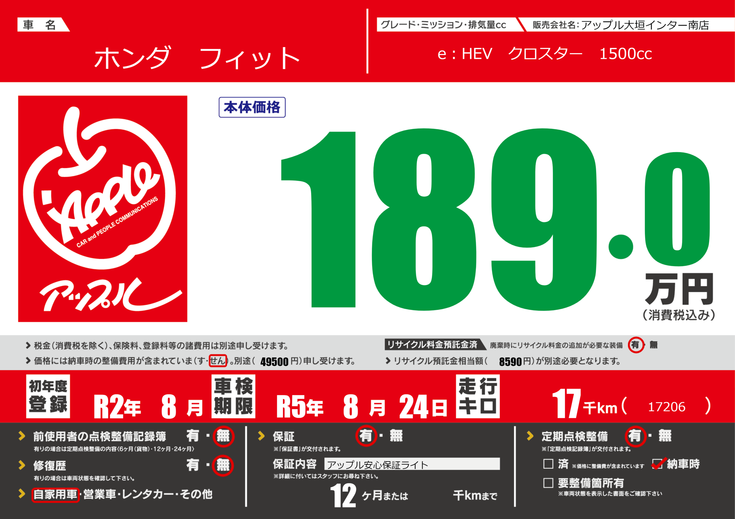 | 車名 | ホンダ フィット | グレード ミッション 排気量 |