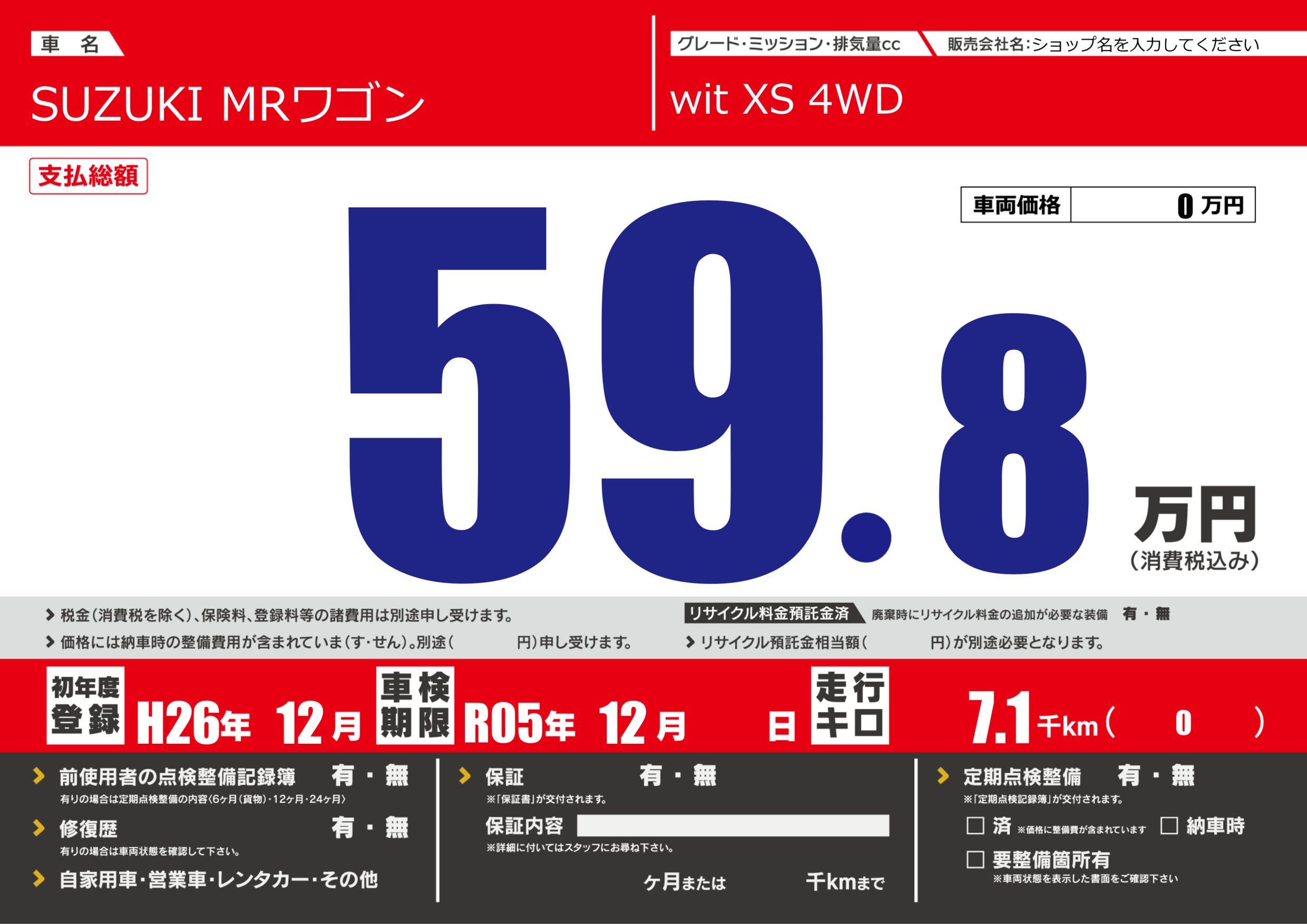 | 車名 | SUZUKI MRワゴン | グレード ミッション 排気量 |