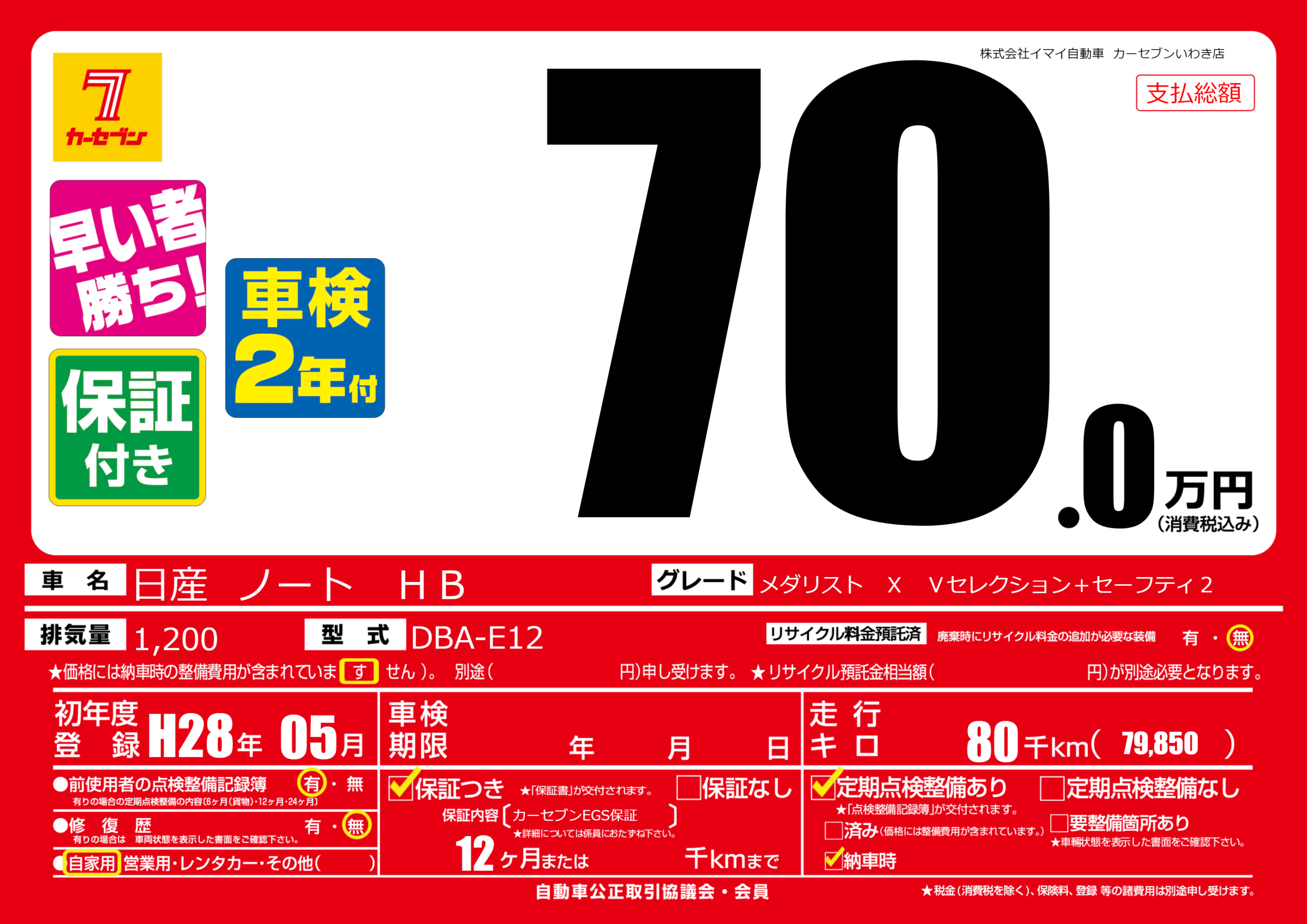 | 車名 | 日産 ノート HB | グレード ミッション 排気量 |