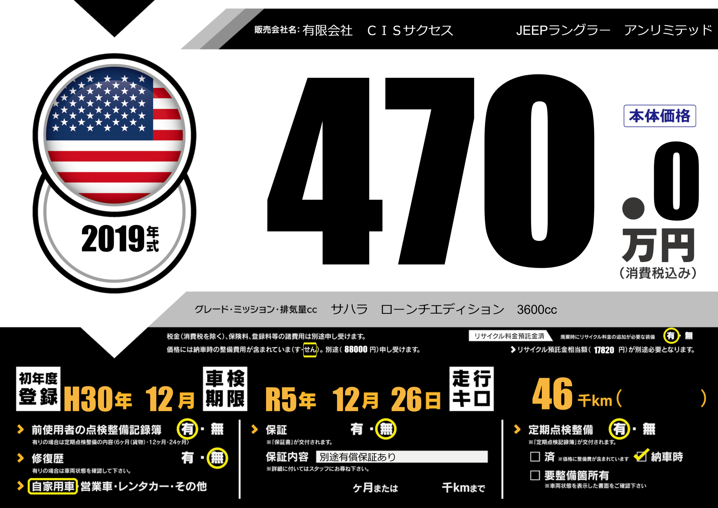 | 車名 | JEEPラングラー アンリミテッド | グレード ミッション 排気量 |
