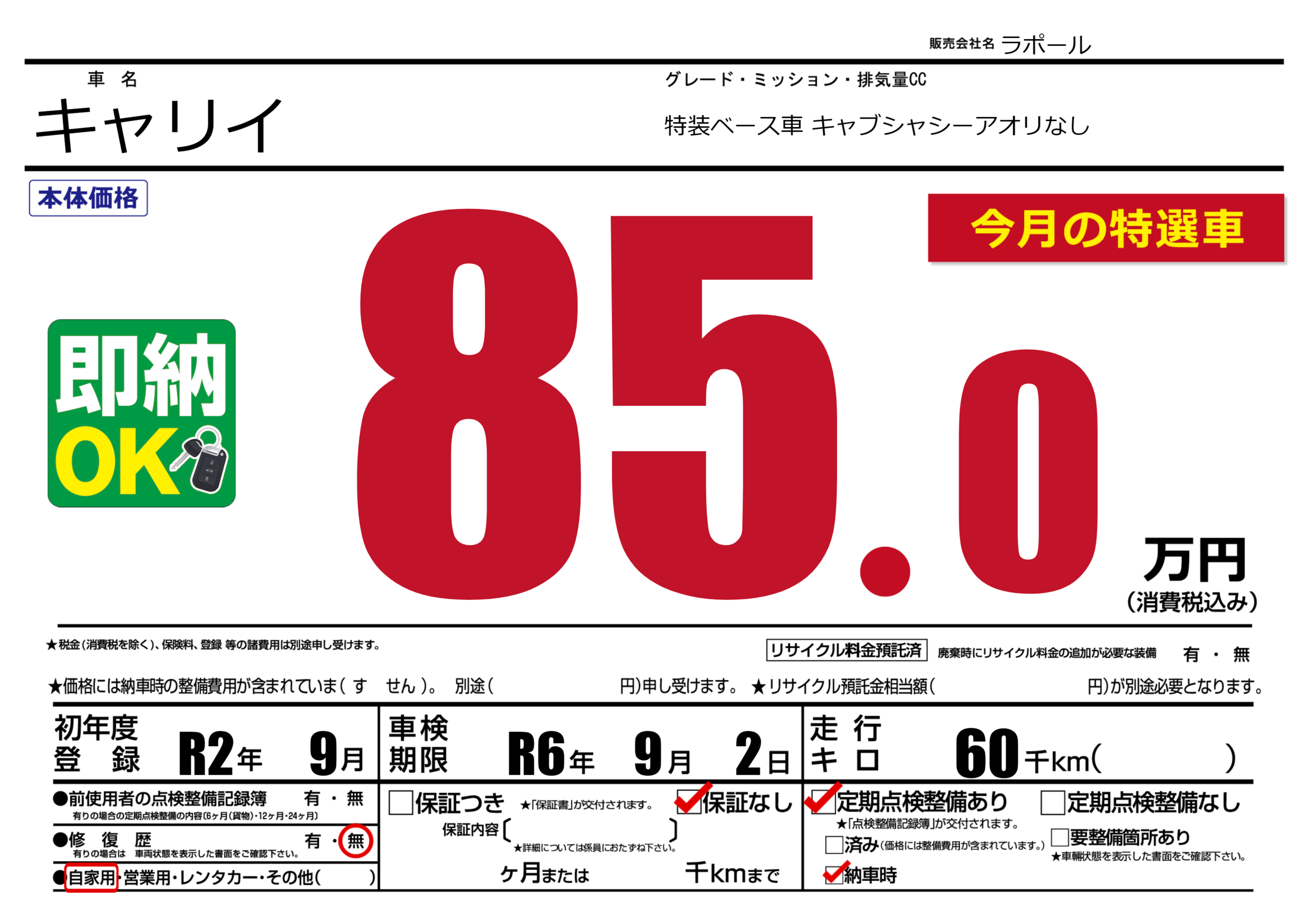なし | 車検制限 | R6年9月2月 |
