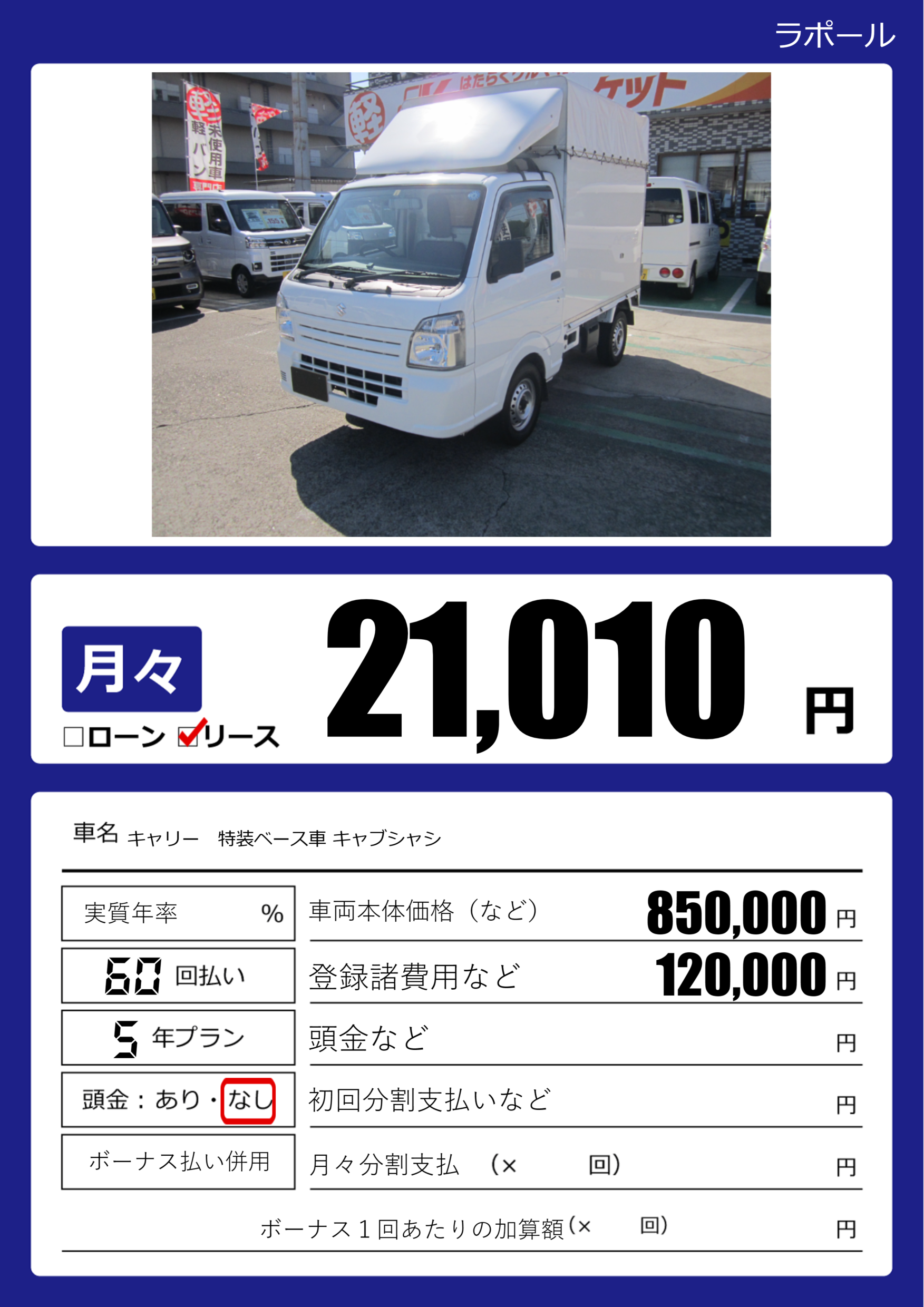 | 車名 | キャリー 特装ベース車 キャブシャシ | グレード ミッション 排気量 |